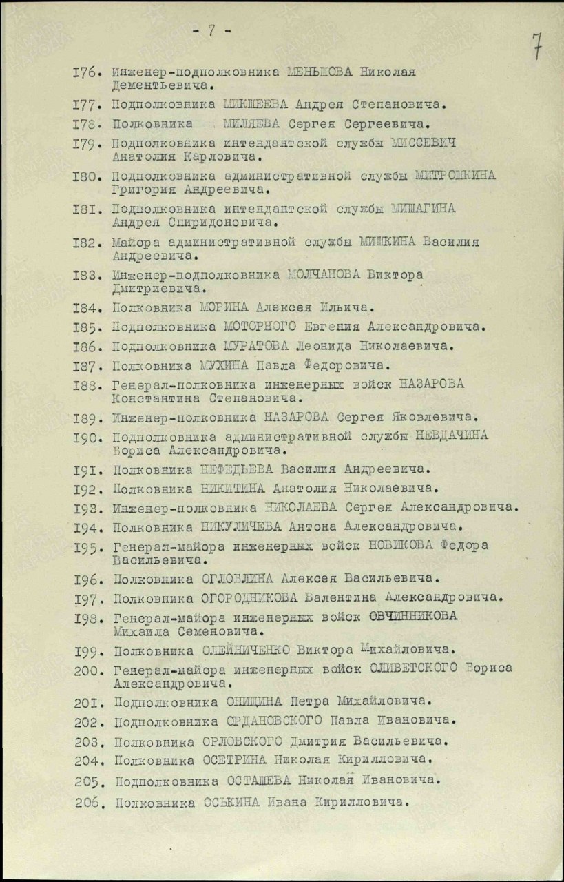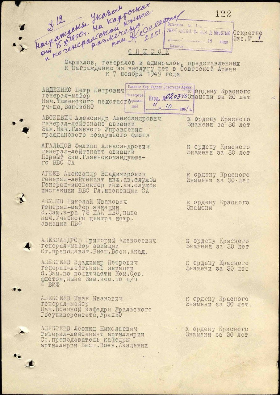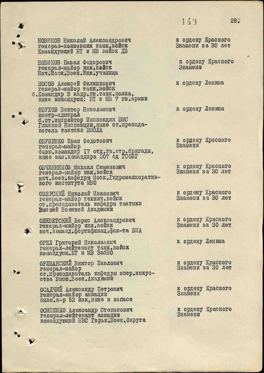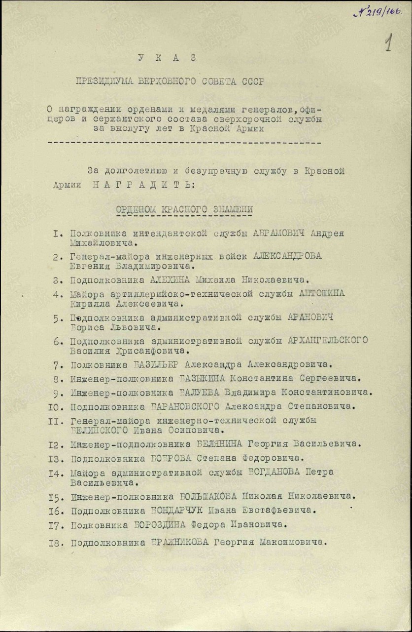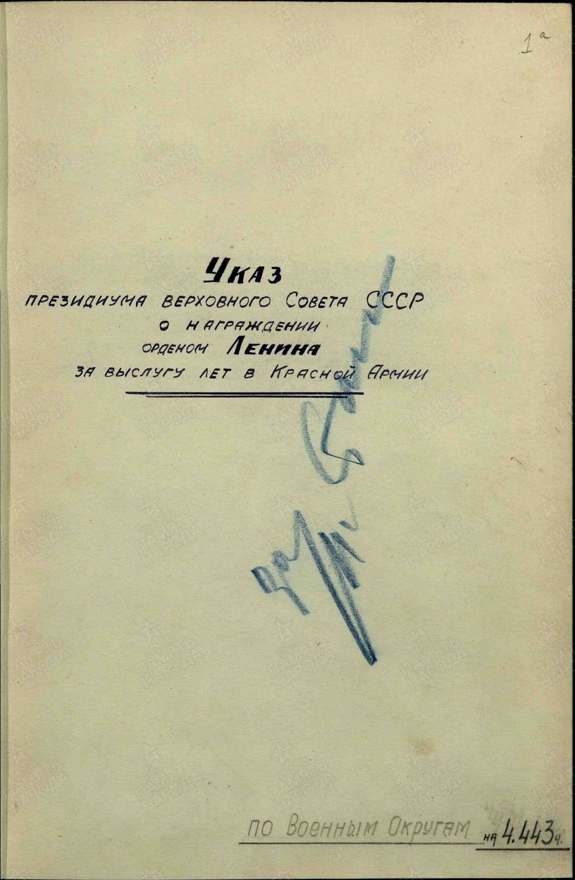 Орден Ленина Воинское звание: генерал-майор инж. войск Воинская часть: Высшее воен.-инж. строит. уч-ще (Московский торфяной институт НКЭС, г. Москва) Дата документа: 21.02.1945