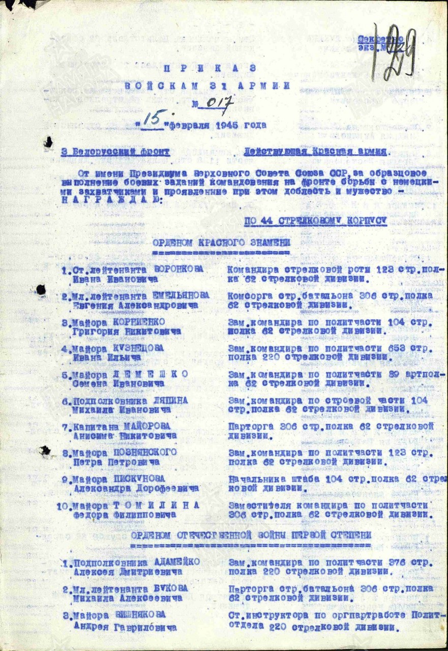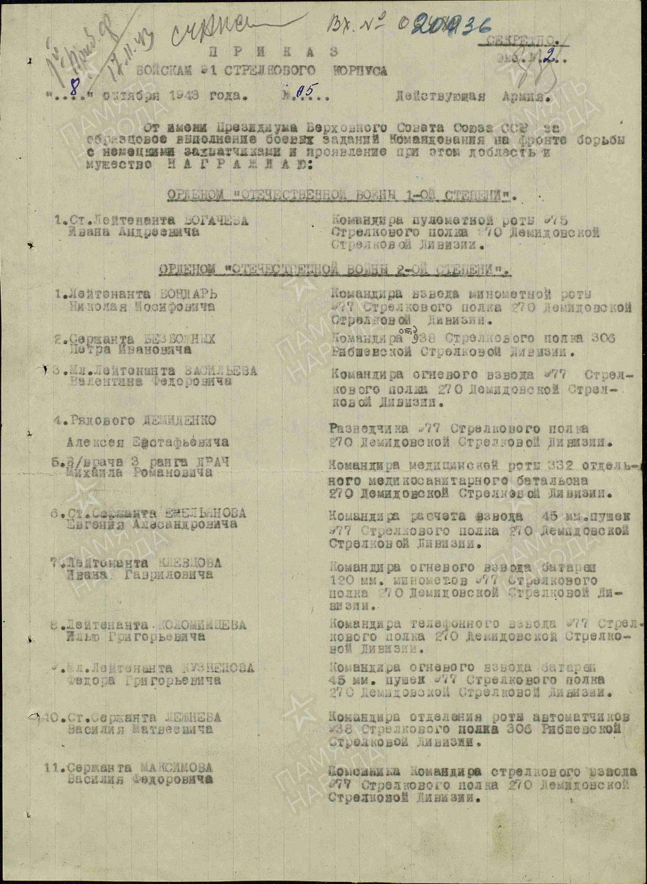 | Участие в ВОВ | - | Воинское звание: ст. сержант ; лейтенант ; мл. лейтенант, майор Воинская часть: 977 стрелковый полк 270 стрелковой дивизии (II) 977 стрелковый полк 270 стрелковой дивизии (I) 31 армия 91 стрелковый корпус 306 стрелковый полк 62 стрелковой дивизии (III) История: Медаль "За отвагу" (1943),Орден Отечественной войны II степени (1943),Орден Красного Знамени (1945),Орден Красной Звезды (1956) Медаль "За отвагу" (1943) , Орден Отечественной войны II степени (1943) , Орден Красного Знамени (1945) , Медаль «За взятие Кенигсберга» (1945) Медаль «За боевые заслуги» 1952, Орден Красной Звезды (1956) | |