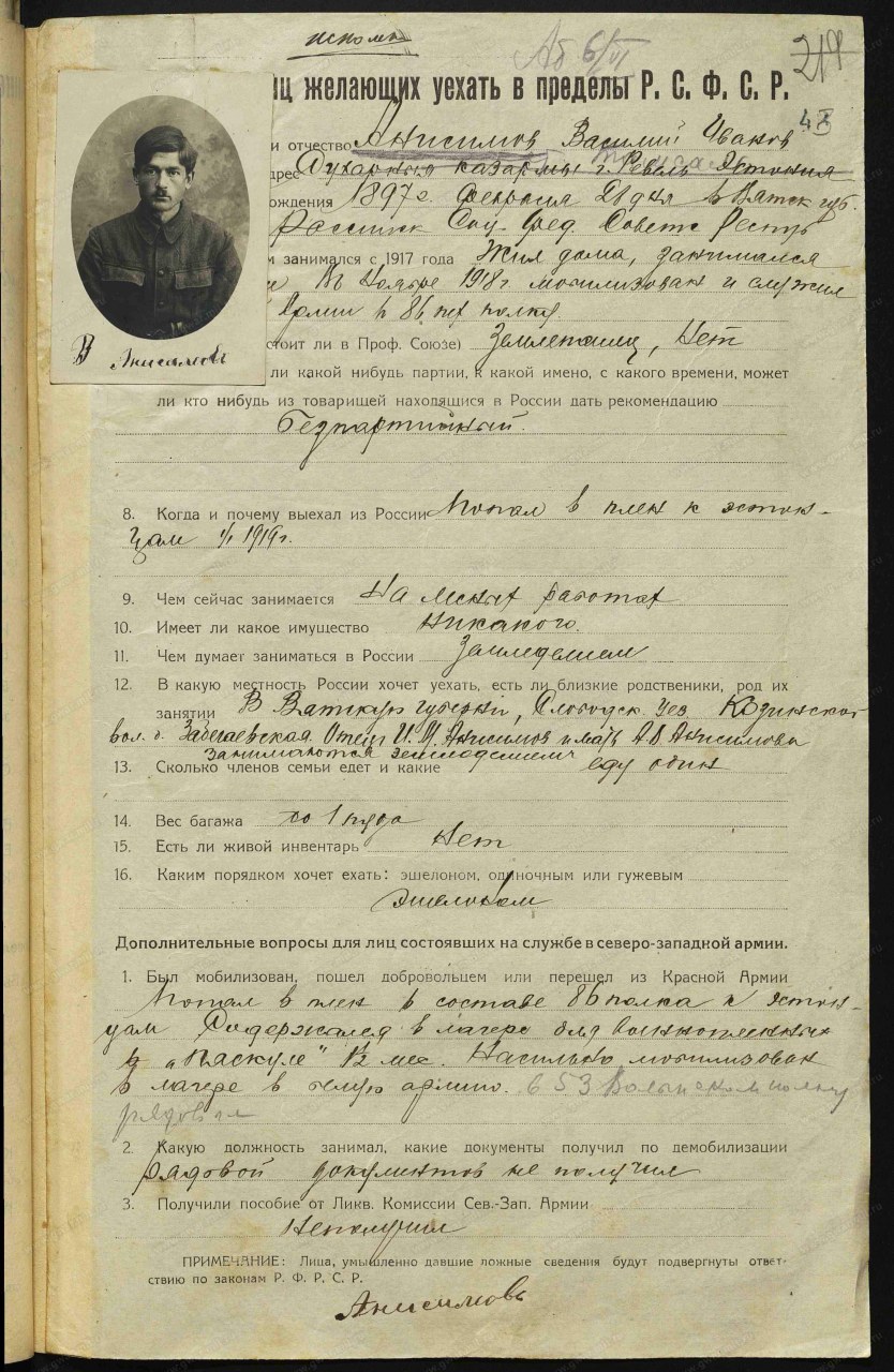 Анкета для лиц, желающих уехать в пределы РСФСР 1