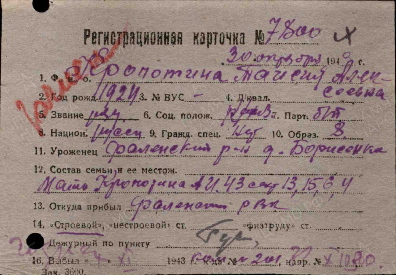| участие в Великой Отечественной войне | - | Воинское звание: рядовой Военно-пересыльный пункт: Военно-пересыльный пункт Кировского областного военкомата, Кировская обл. Выбытие из воинской части: 04.11.1943 Откуда прибыл: Фаленский РВК Номер команды: 201 Информация об архиве - Источник информации: ЦАМО Фонд ист. информации: Кировский ВПП Опись ист. информации: 172205 Дело ист. информации: 43453 | |