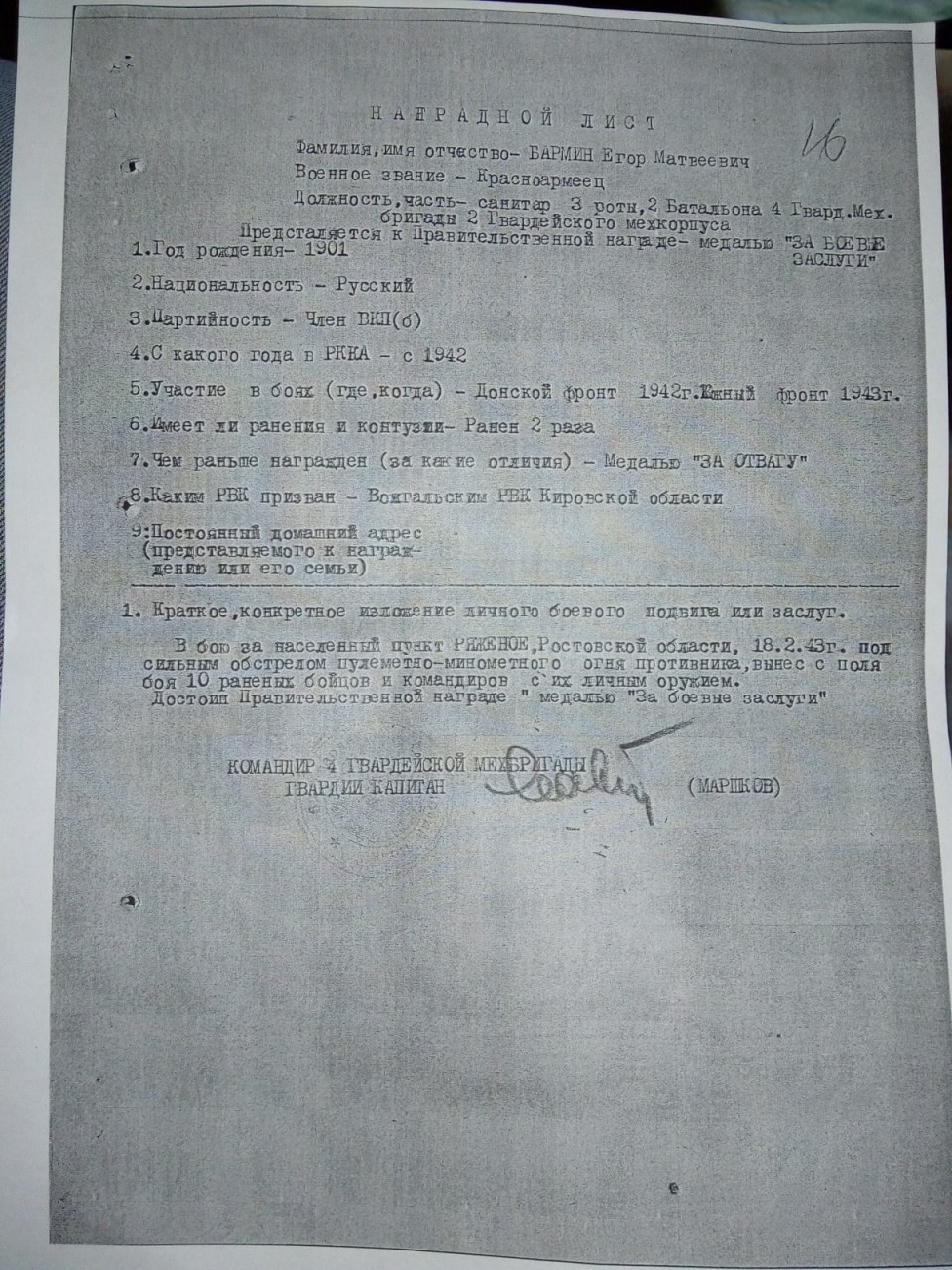 Красноармеец Бармин Егор Матвеевич, 1901 г.р., санитар 3 роты, 2 батальона 4 Гвардейской механизированной бригады 2 Гвардейского корпуса. Призвался в ряды красной армии в 1942 году. Участвовал в боях на Донском и Южном фронтах. В бою за населённый пункт Ряженое, Ростовской области, 18.02.1943 г. под сильным обстрелом пулемётно- миномётного огня противника, вынес с поля боя 10 раненых бойцов и командиров с их личным оружием. Удостоин Правительственной награды " За боевые заслуги". Так же награждён медалью "За отвагу". Погиб в бою и захоронен под д. Родионовская, Ростовской области, 31 августа 1943 года.