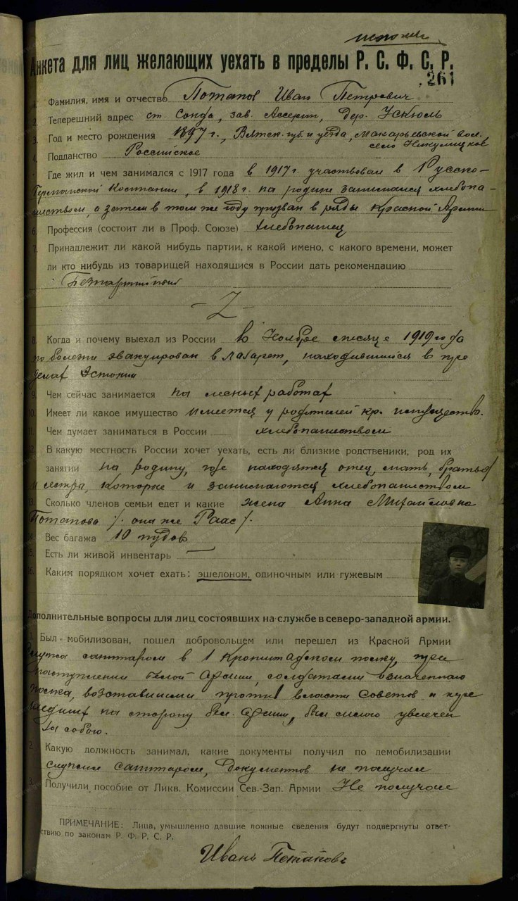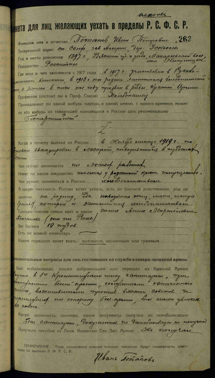 Анкета для лиц, желающих уехать в пределы РСФСР