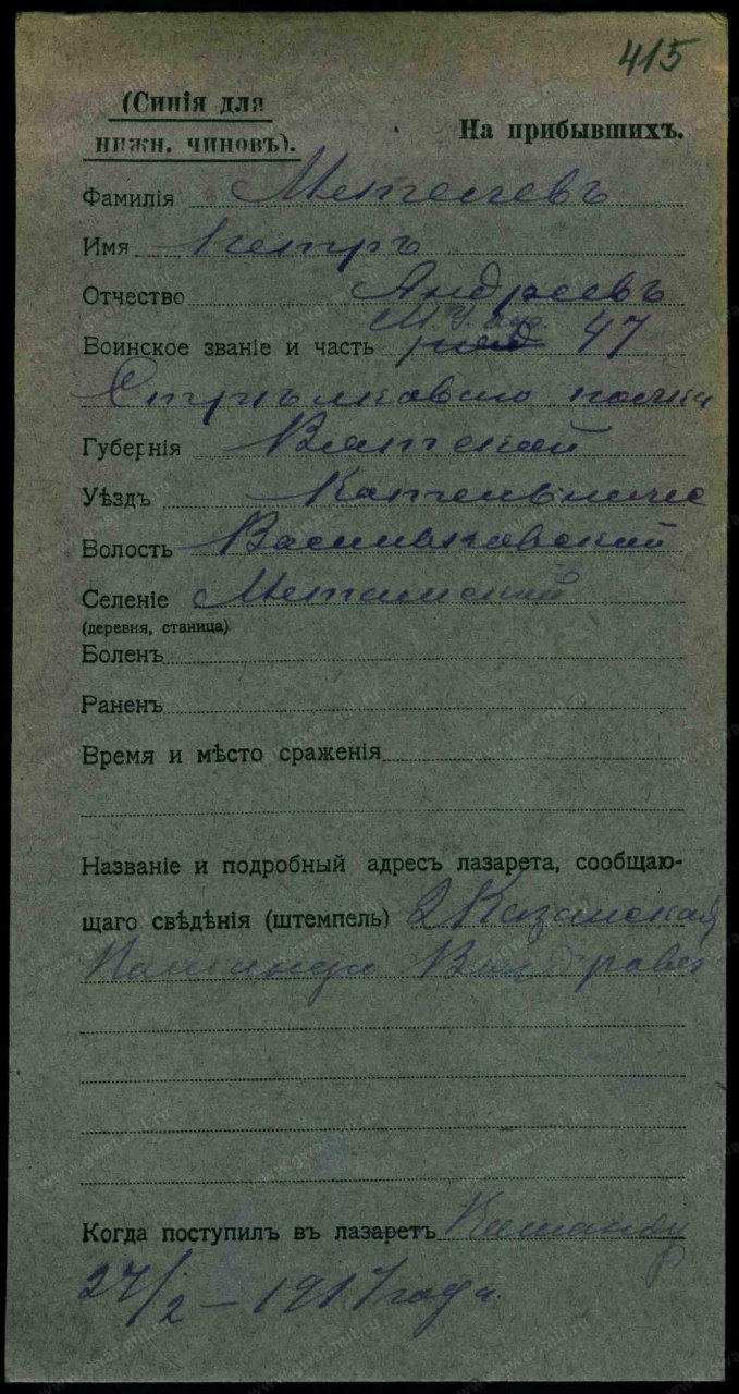 | Поступил в госпиталь | 12.02.1917 | Прибыл из г. Москва в госпиталь №2 г.Казань | |