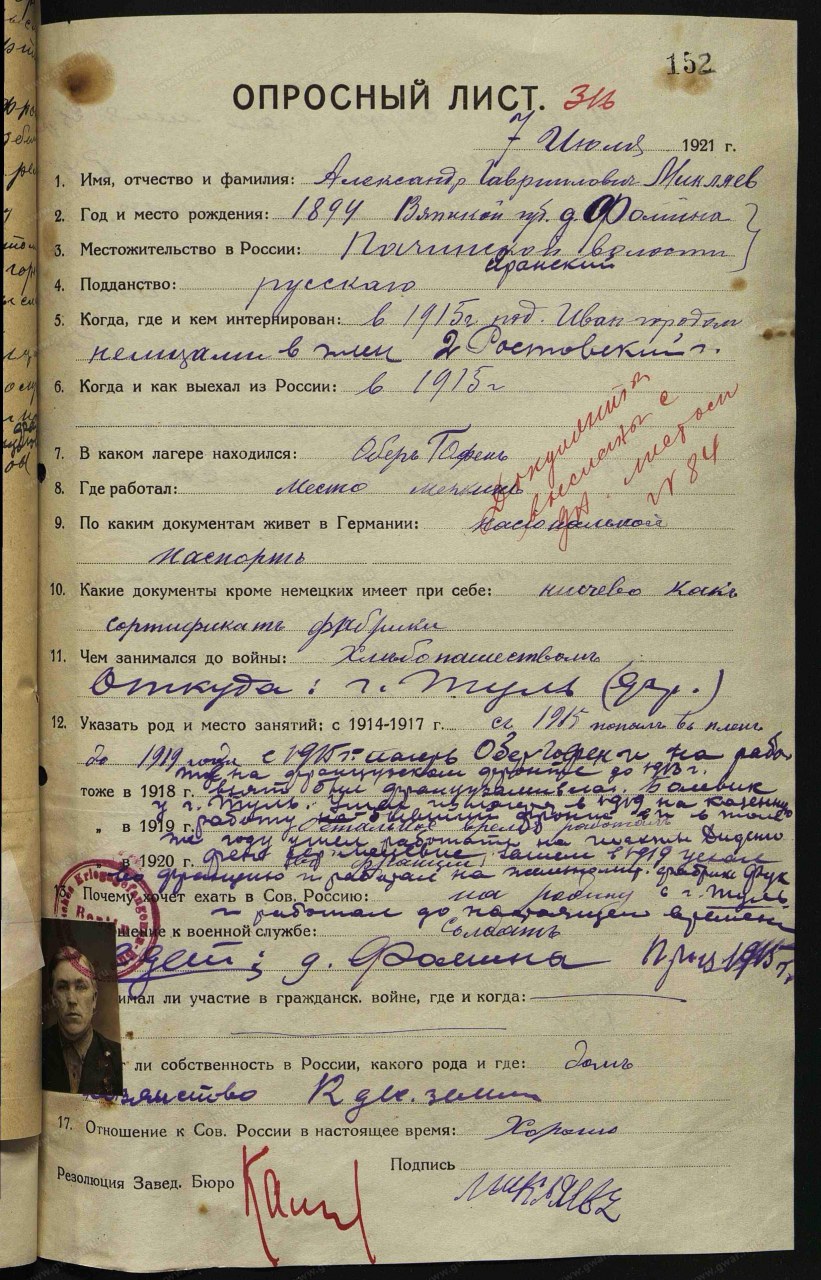 Опросный лист военнопленного, ходатайствующего о зачислении в лагерь, для отправки в Советскую Россию