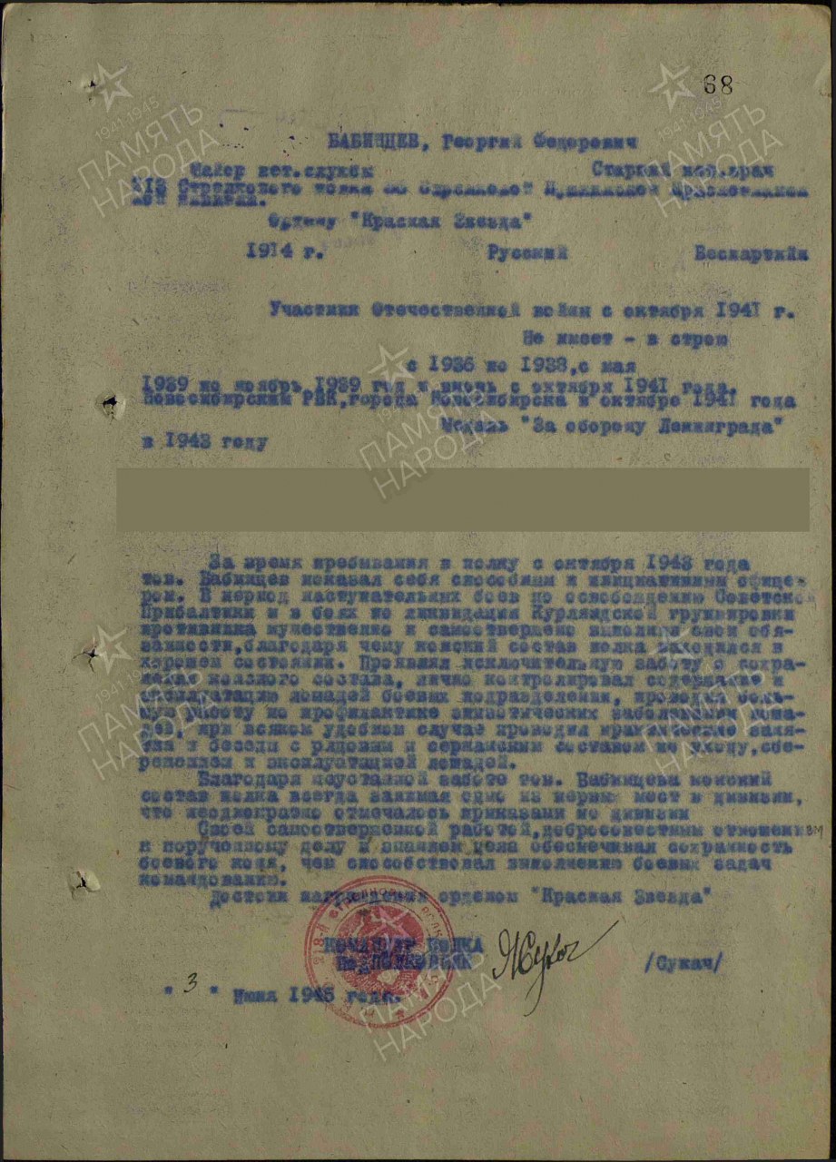 Место призыва: 30.12.1941 Новосибирский РВК, Новосибирская обл., Новосибирский р-н