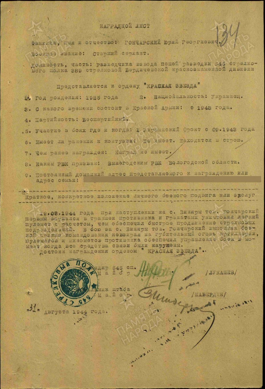 Военно-пересыльный пункт: 34 зсп Прибыл в часть: 12.07.1943