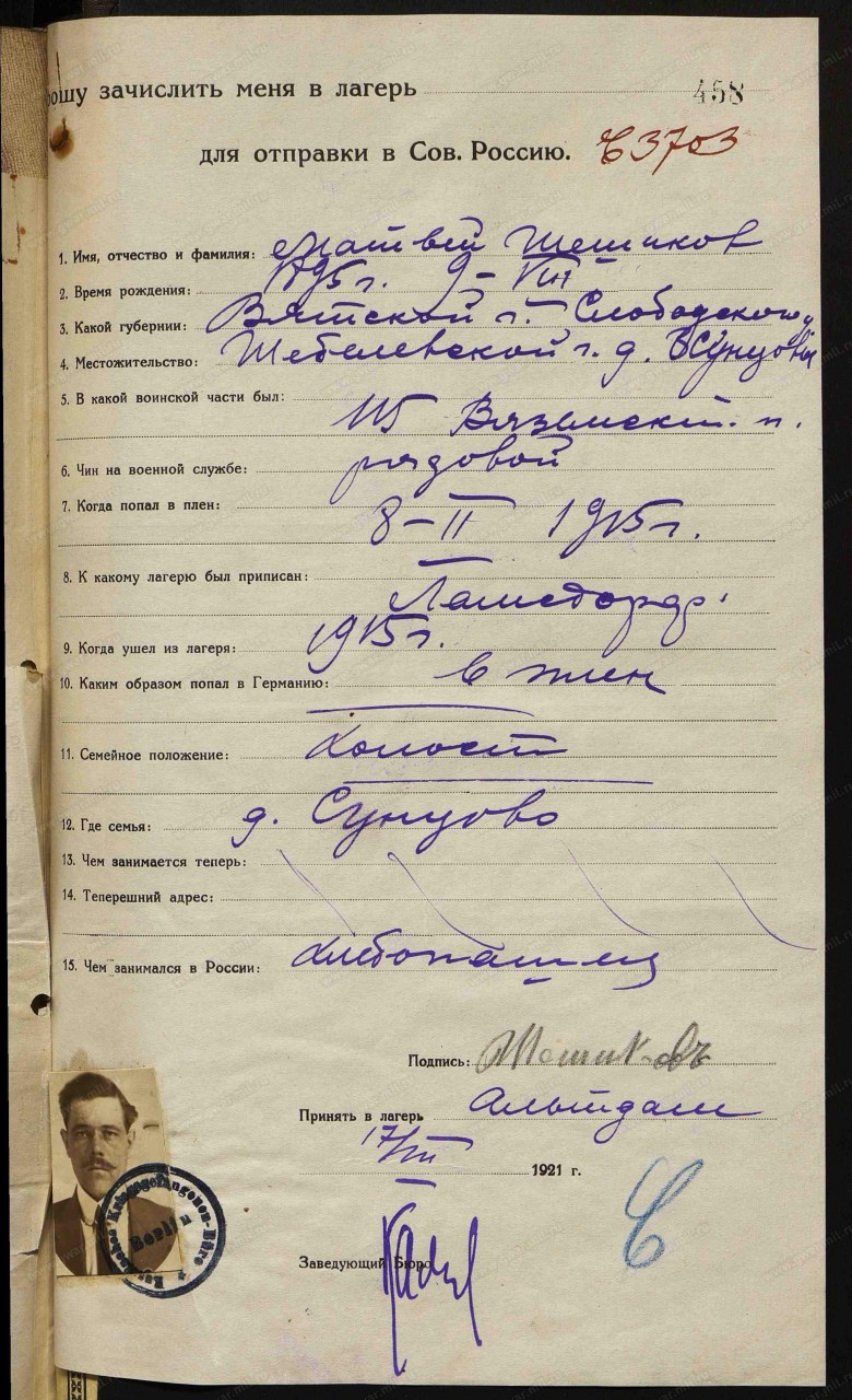 | Родился | 09.08.1895 | деревня Сунцовы (Тагинская) (Слободской район, Кировская область) - существующий н.п. | д. Сунцовы, Шепелевская волость, Слободской уезд, Вятская губерния, https://gwar.mil.ru |