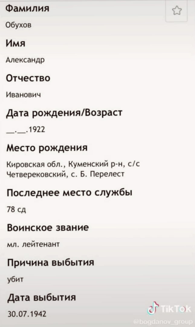 | 4305155010 | ОБУХОВ Александр Иванович | 1922 г. р., д. Б. Перелаз Четвериковского с/с, призван Кировским РВК, мл. лейтенант, ком-р взвода, 78 сд, 458 сп, погиб в бою 30.07.1942 г., захоронен в Тверской обл., д. Подсосенье. | Кировская область, Куменский район |
