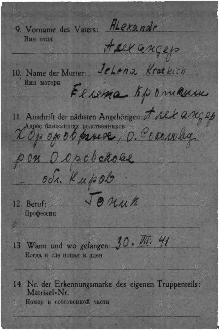 | Плен | 30.07.1941 | под г. Житомир | Лагерь: шталаг II A. Лагерный номер: 86051 Stalag II A Neubrandenburg Лагерь был расположен в Fünfeichen, бывшем имении в черте города Нойбранденбург в Мекленбург,в Померания , северная Германия . Сегодня, на месте лагеря "Мемориал" с 1939 года использовался для польских пленных.с !940 года содержались голландцы,бельгийцы и французы. С 1941 года в него прибывать начали и советские военнопленные,для которых отвели отдельную зону к югу от основного лагеря. С 1944 года содержались американские пленные. В 1945 году лагерь использовался как транзитный для эвакуированных военнопленных из лагерей отступающих перед Советской Армией с востока. Освобожден 28 апреля 1945 года войсками Советской Армии. На декабрь 1944 года содержалось: 12581 французский, 8694 русских, сербов, 1976; американцев 950; 738 поляков, итальянцев, 527, 200 британских. Всего 25720, в том числе 21 офицеров. В лагере было создано около 50 рабочих команд, известный как Arbeitskommando .Самая большая команда работала в Teterow, в нескольких милях к западу от Нойбранденбург.В ней находилось 175 заключенных, живущих в многоэтажных кирпичное здание. Они работали на железной дороге. Другая крупная команда работала в Parchim Ссылка по теме: Stammlager Neubrandenburg/Fünfeichen http://de.wikipedia.org/wiki/Stammlager_Neubrandenburg/F%C3%BCnfeichen . Информация об архиве - Источник информации: ГА Кировской области Фонд ист. информации: Трофейная и фильтрационная картотека, ф. Р3819 Опись ист. информации: 1А Дело ист. информации: 9369 |
