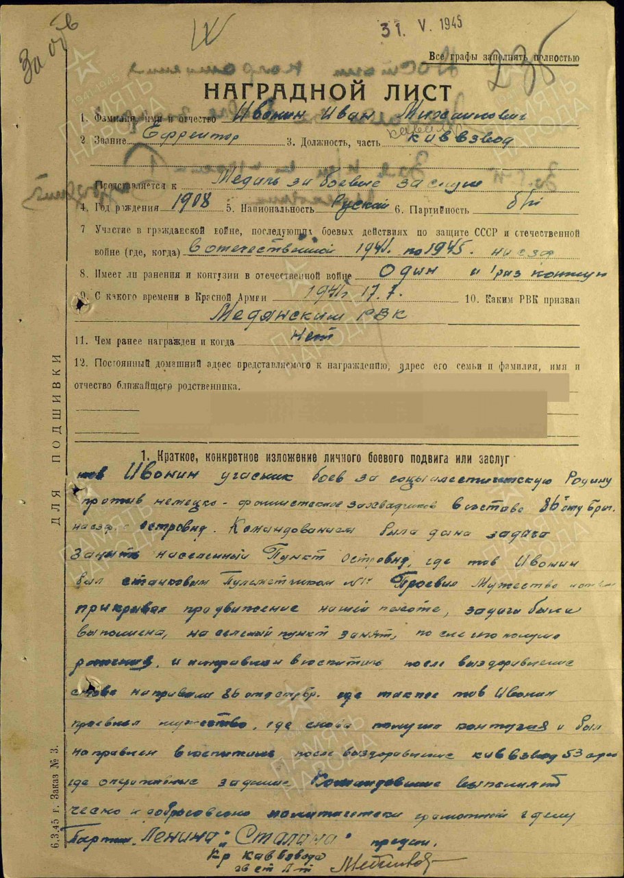 Одно ранение и контузия при обороне нп Островня на Северо-Западном Фронте.