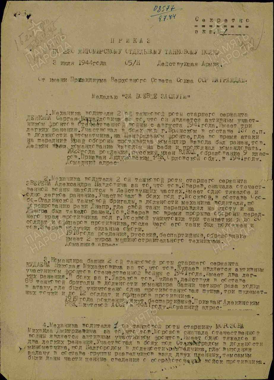 Воинская часть: 31 зсп Выбытие из воинской части: 02.12.1943
