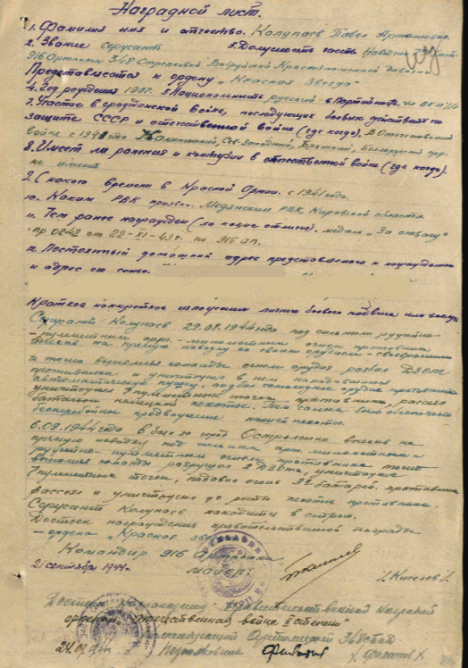 Орден Красной Звезды Воинское звание: сержант, наводчик 7 батареи 916 арт полка 348 сд Приказ подразделения №: 263 от: 04.10.1944 Издан: 348 сд 2 Белорусского фронт