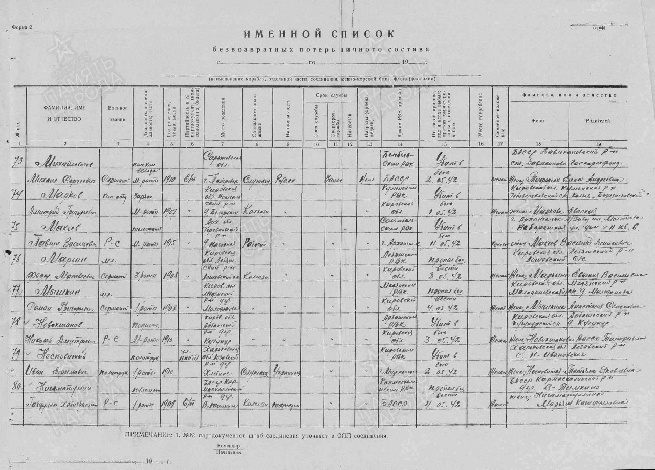 | 4314143018 | МИШКИН Роман Григорьевич | 1908 г. р., из дер. М. Долгое Монастырского с/с, мл. сержант, командир отделения 6 б 12 обрмп Северного флота, в 1942 г. пропал без вести. | Кировская область, Юрьянский район |