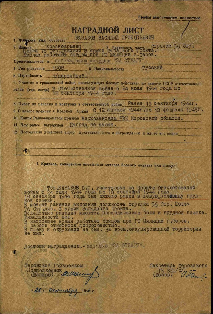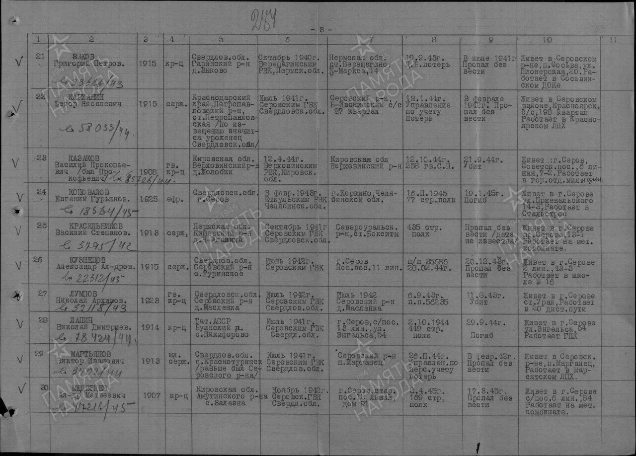 | 4314080019 | КАЗАКОВ Василий Прокопьевич | 1908 г. р., из г. Серова, гв. красноармеец, стрелок 258 гв. сп, 56 гв. сд, 21.09.1944 года погиб в бою. Захоронен в Латвии, с. Лациши. | Кировская область, Юрьянский район |