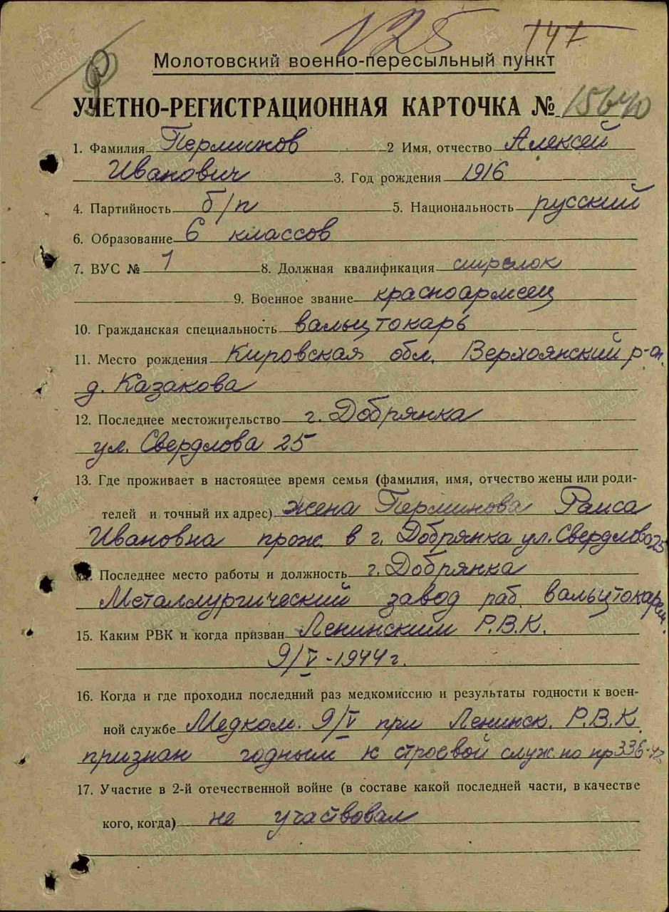 Военно-пересыльный пункт: Молотовский ВПП Выбытие из воинской части: 14.05.1944