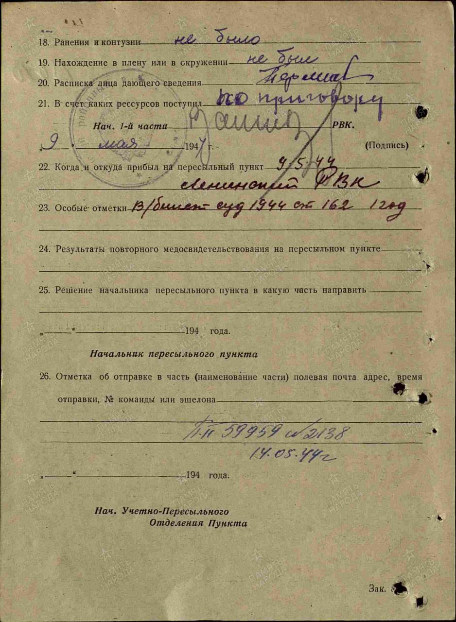Военно-пересыльный пункт: 23 ошб 44 зсд Выбытие из воинской части: 30.05.1944