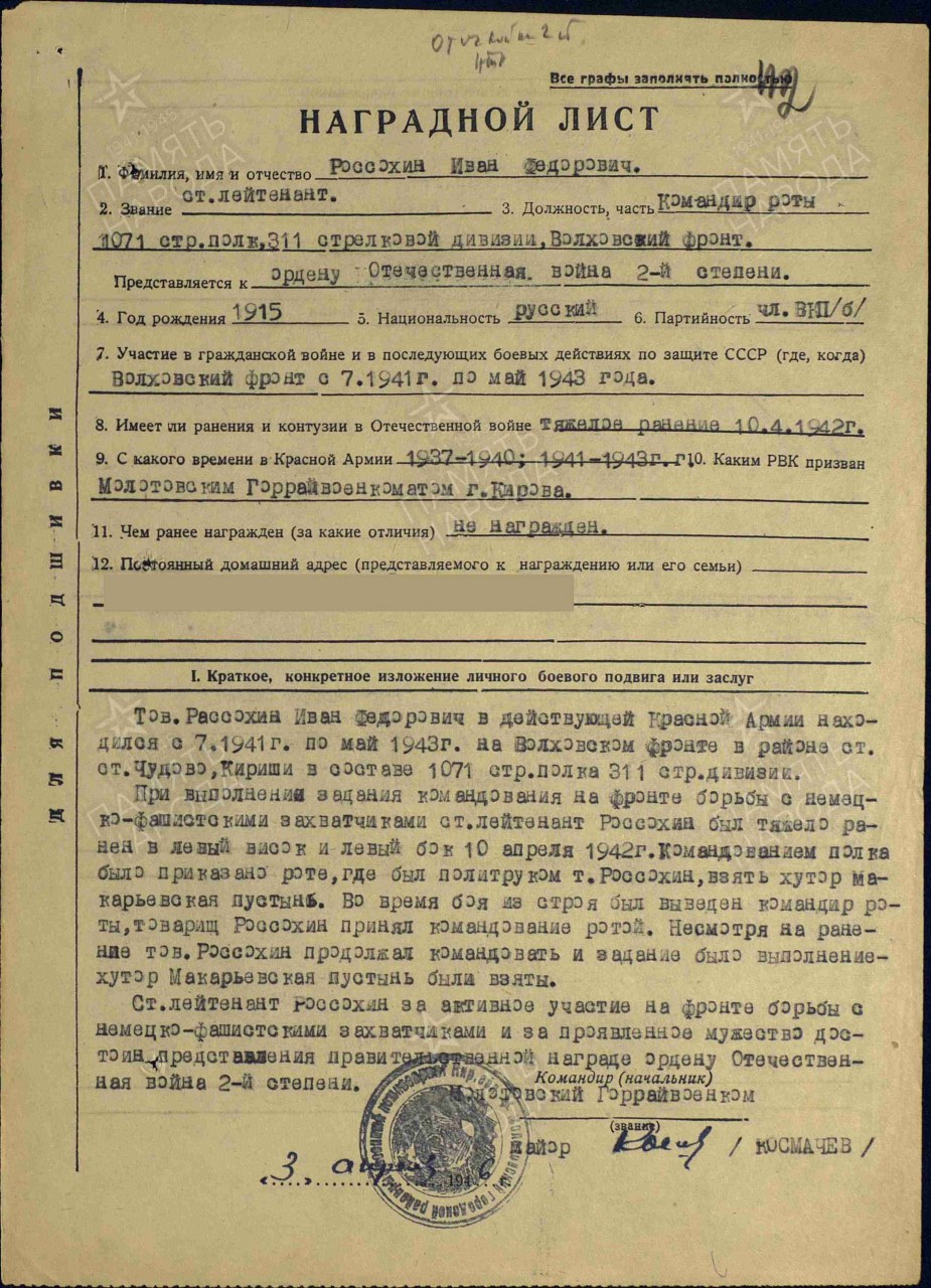 Военно-пересыльный пункт: Волховский ВПП Выбытие из воинской части: 28.04.1942