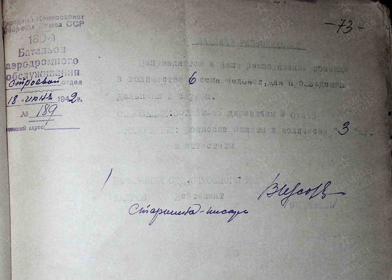 Воинская часть: 180 батальон аэродромного обслуживания Дата выбытия: 18.06.1942