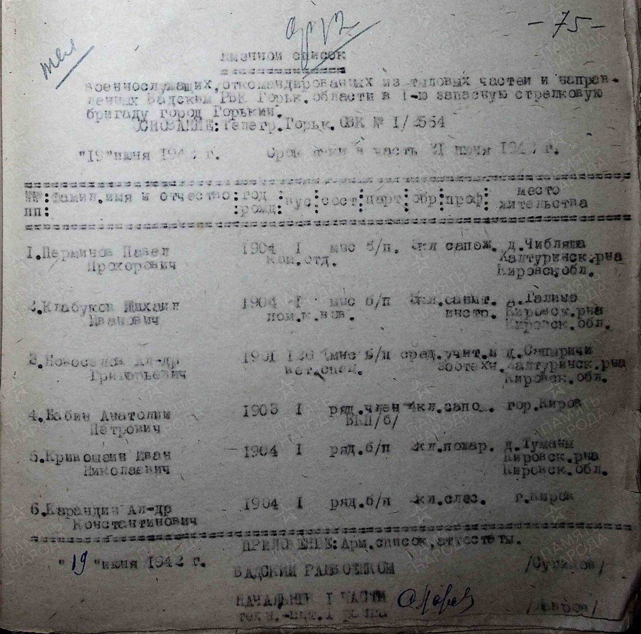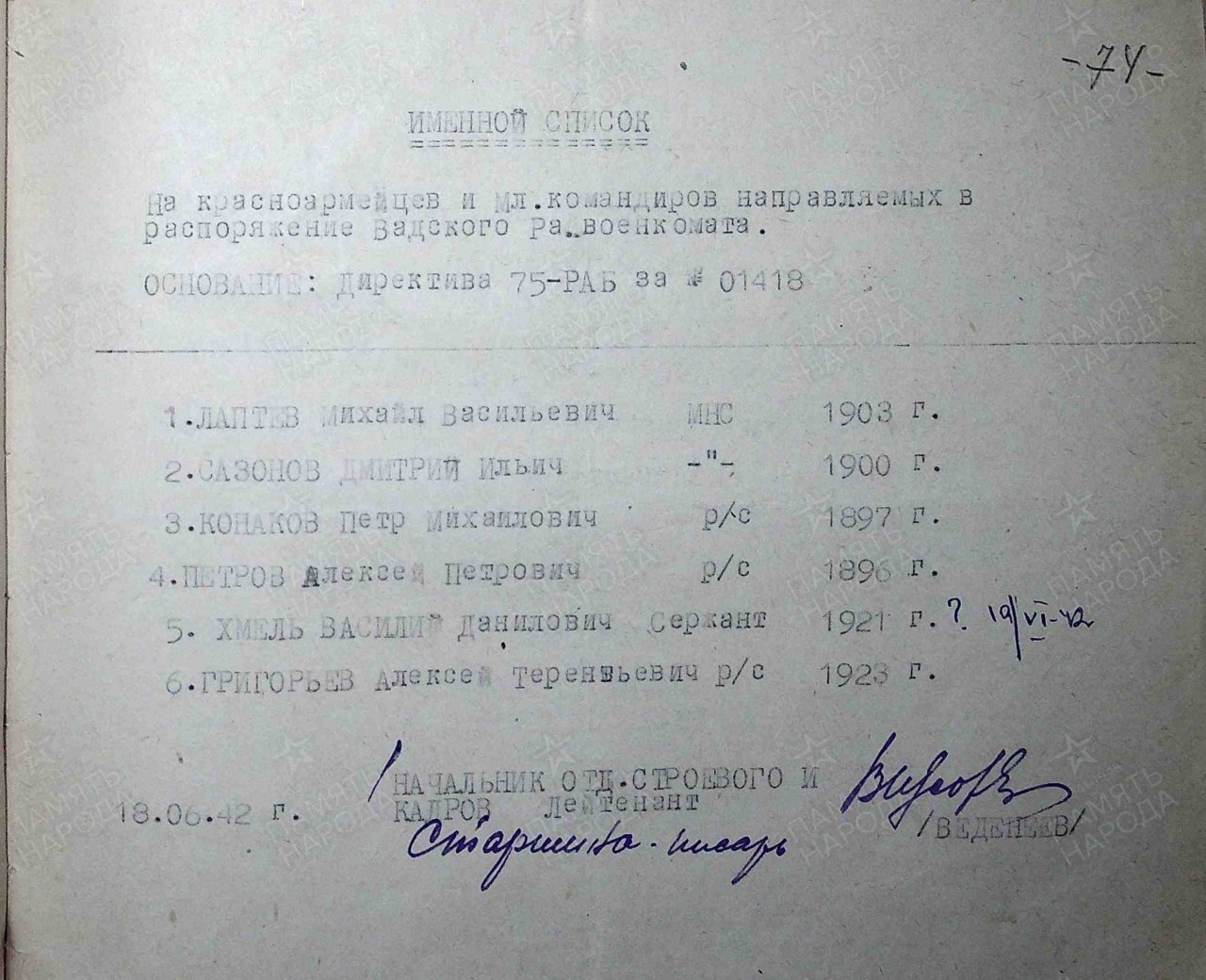 Дата и место призыва: Вадский РВК, Горьковская обл., Вадский р-н Дата выбытия: 18.06.1942