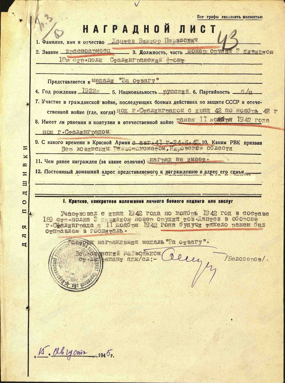 Ранен 11.11.1942 под Сталинградом.
