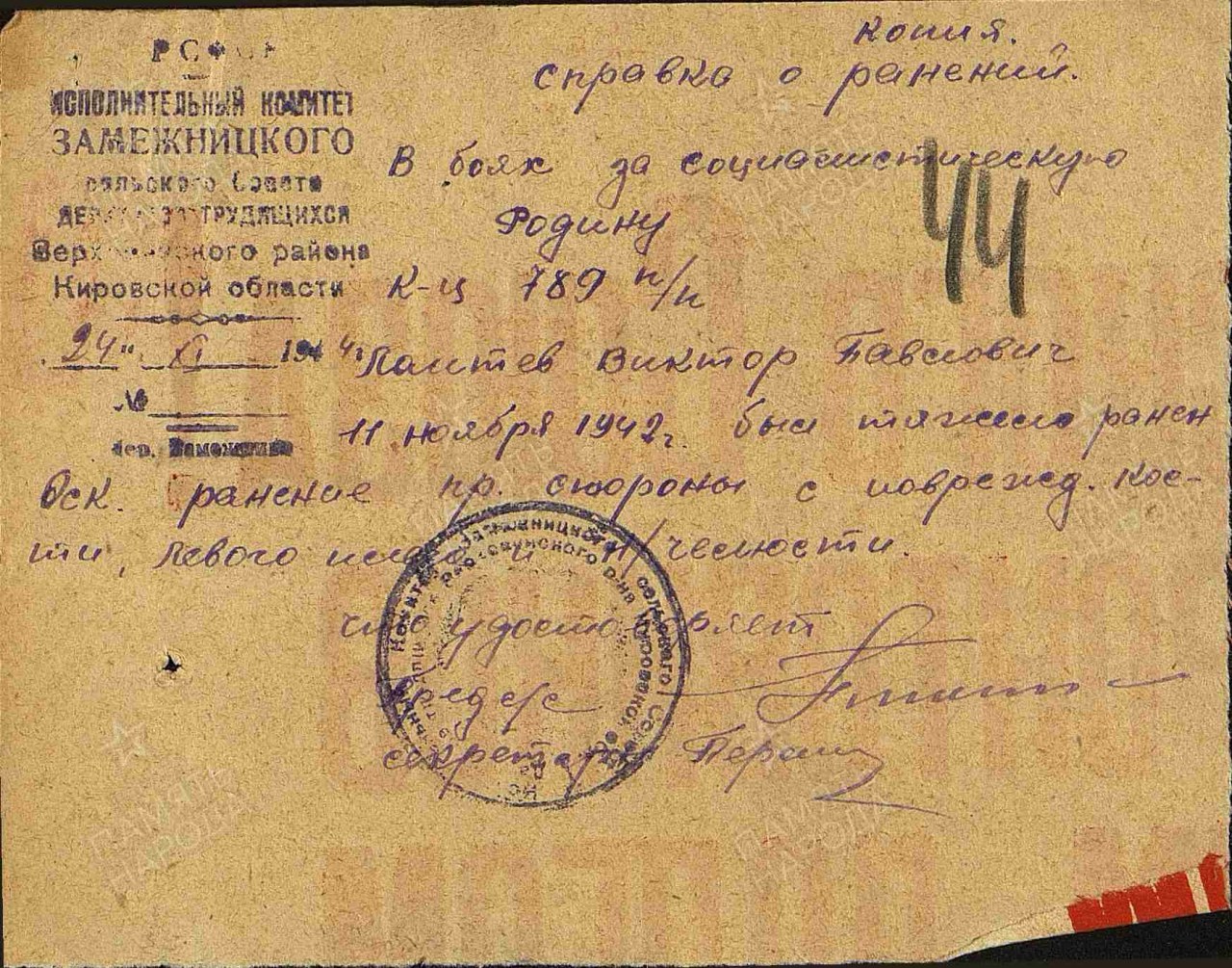 Наименование военкомата: 23.09.1941 Верховинский РВК, Кировская обл., Верховинский р-н