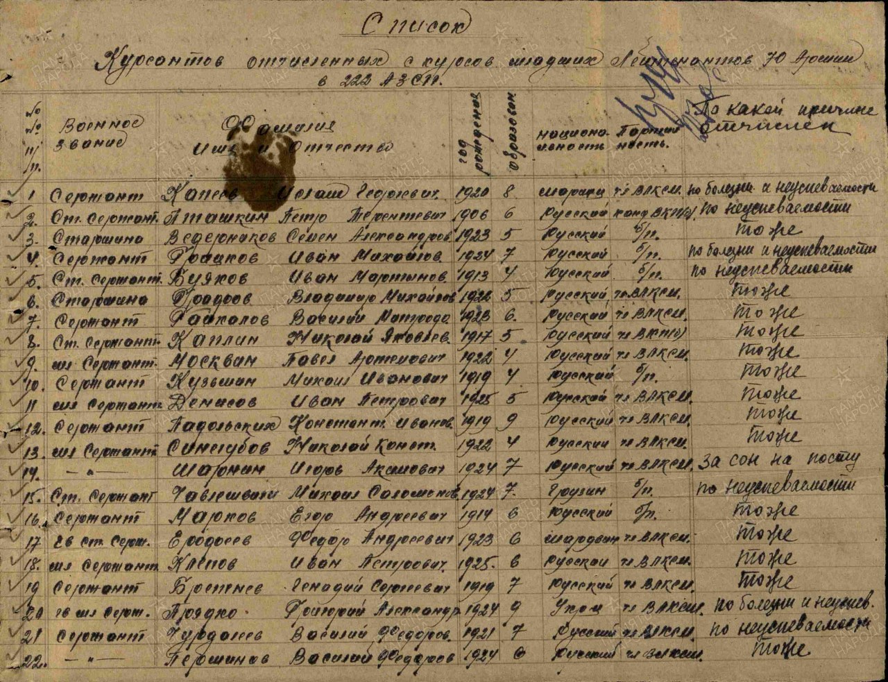 Место службы: 70 А (курсы младших лейтенантов) Выбытие из воинской части: 22.06.1944
