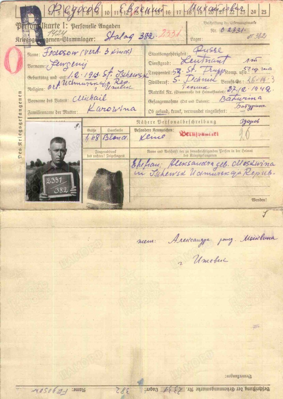 | 1807111032 | ФЕДОСОВ Евгений Максимович | род. 1913, г. Ижевск. Призван в Сов. Армию Ижевским ГВК. Лейтенант. Пропал без вести 7 дек. 1942. | Удмуртская Республика, Ижевск |
