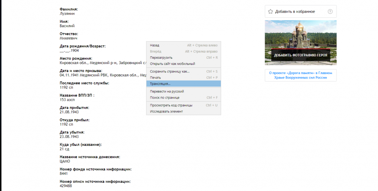 Дата и место призыва: 04.11.1941 Медянский РВК, Кировская обл., Медянский р-н