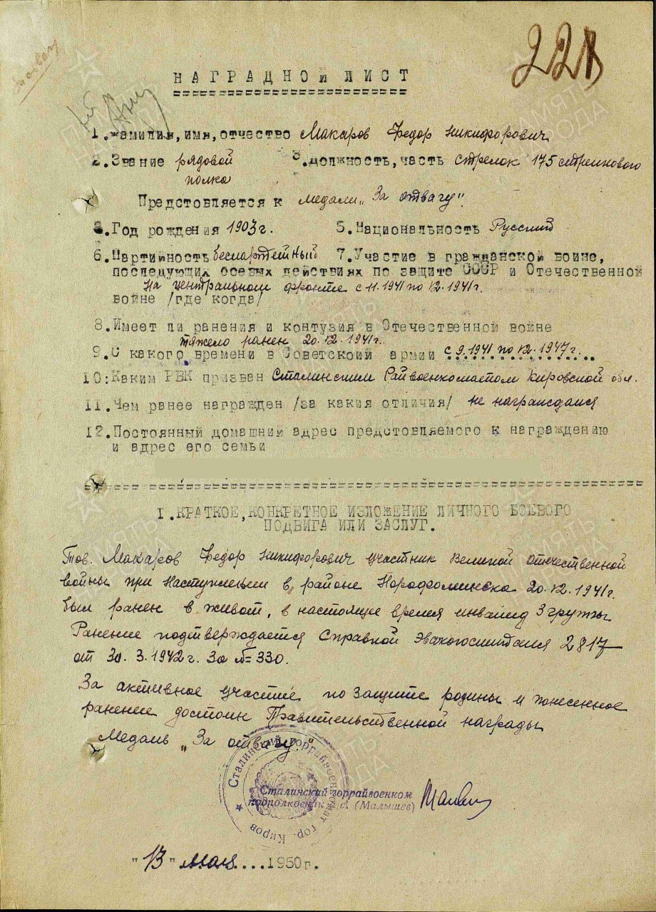 Место призыва: Сталинский РВК, Кировская обл., г. Киров, Сталинский р-н