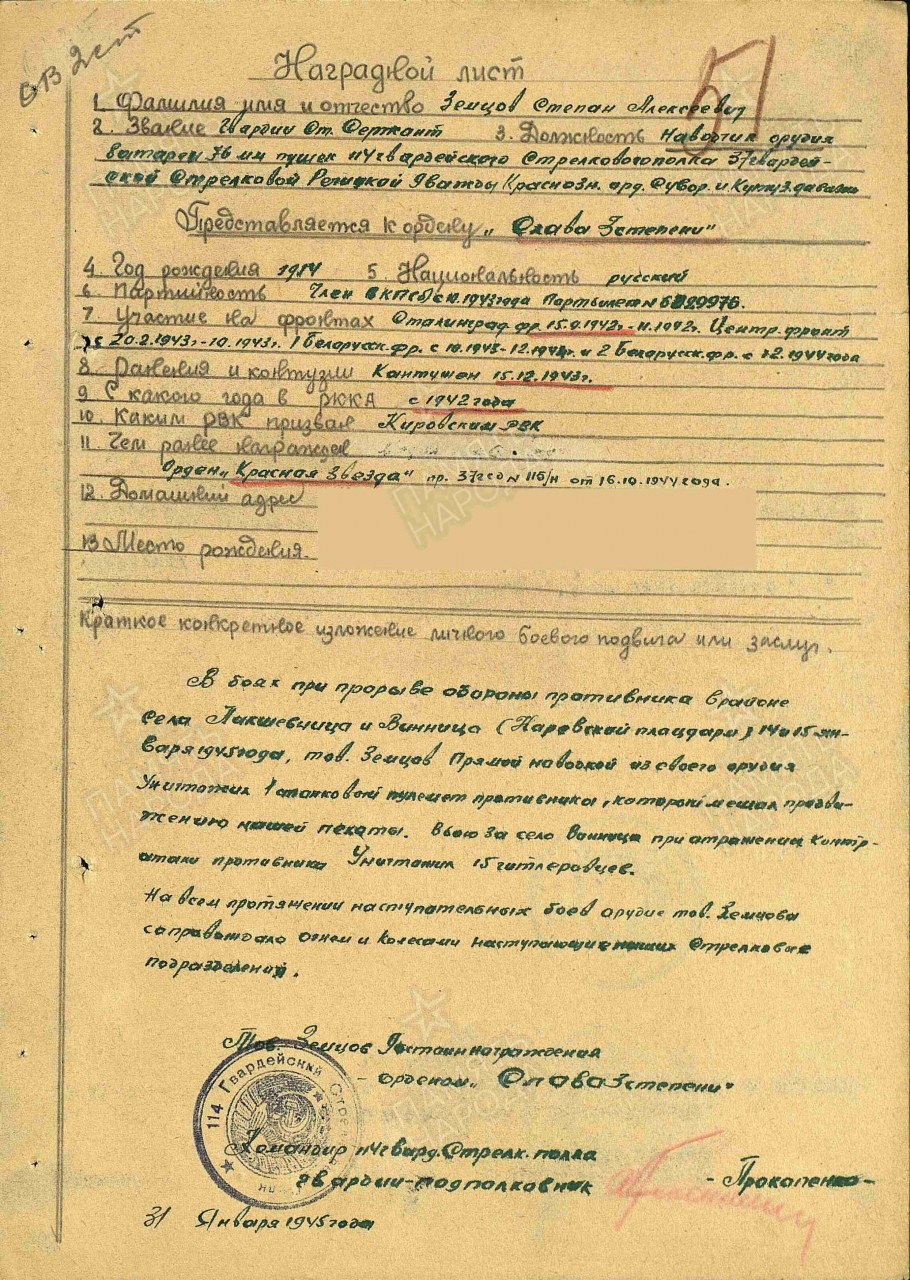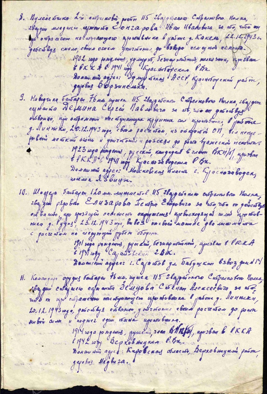 Воинское звание: гв. ст. сержант, ком отделения 76 мм пушек