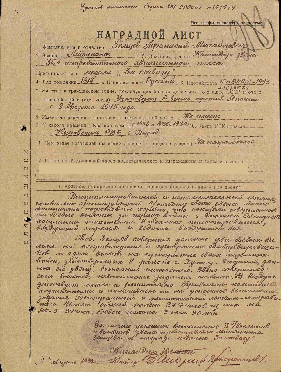 Наименование воинской части: 168 авп ВВС ДВФ,304 иап,917 иап 250 иад,361 иап 250 иад 9 ВА ДВФ