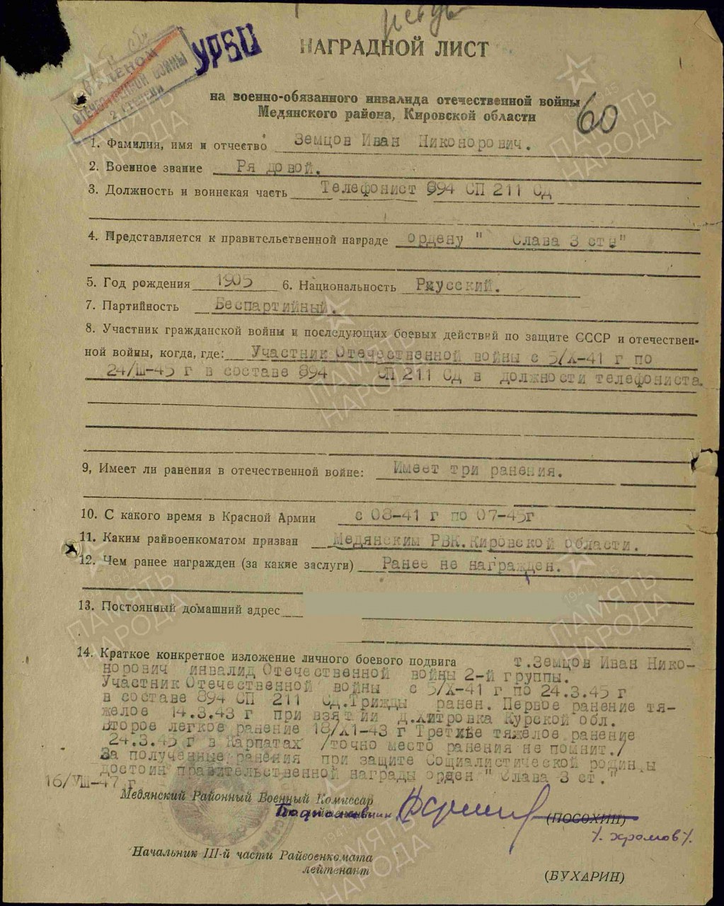 Место призыва: Медянский РВК, Кировская обл., Медянский р-н