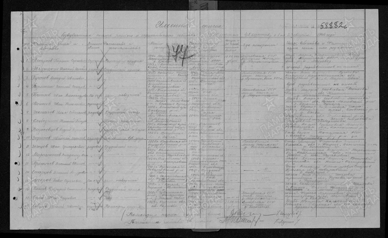 Дата и место призыва: __.__.1940, Сосновский РВК, Челябинская обл., Сосновский р-н