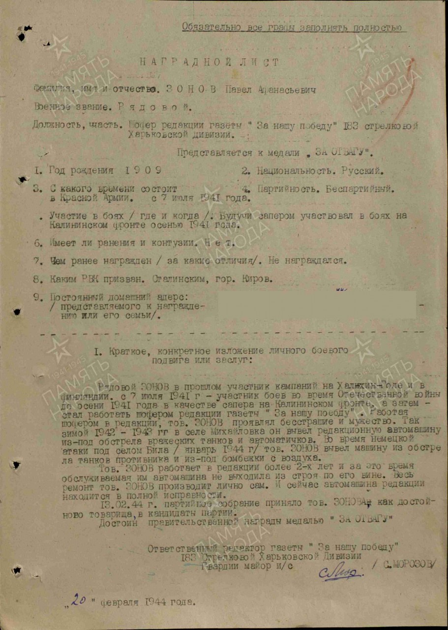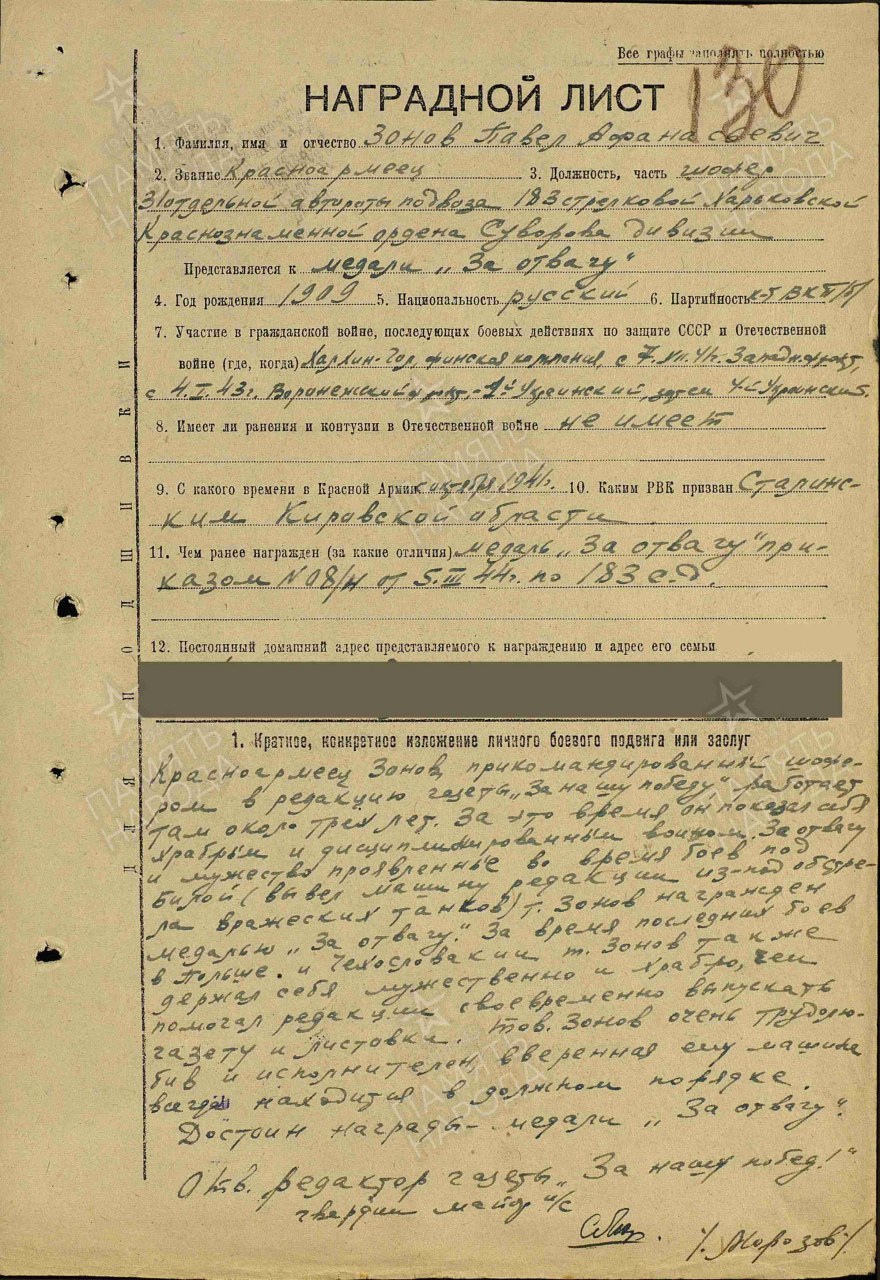 Место призыва: Сталинский РВК, Кировская обл., г. Киров, Сталинский р-н