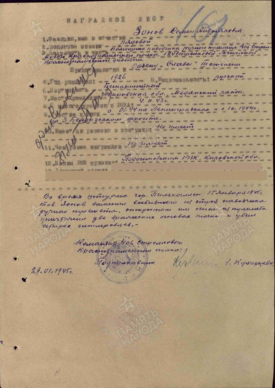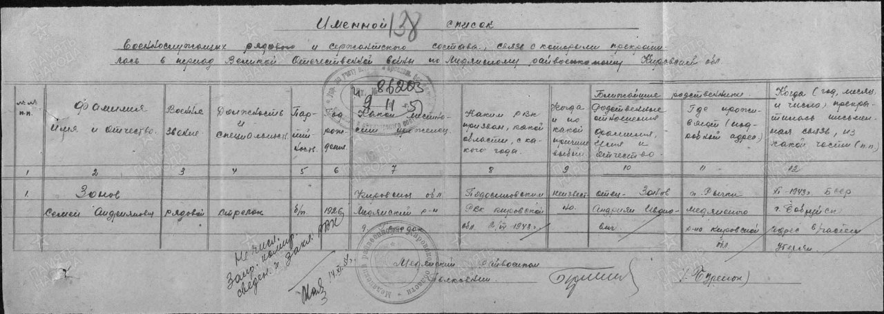 | 4317232005 | ЗОНОВ Семен Андрианович | 1926 г. р., из д. Городок Монастырского с/с Юрьянского района, призван Подосиновским РВК, красноармеец, стрелок, пропал без вести в ноябре 1943 г. | Кировская область, Подосиновский район |