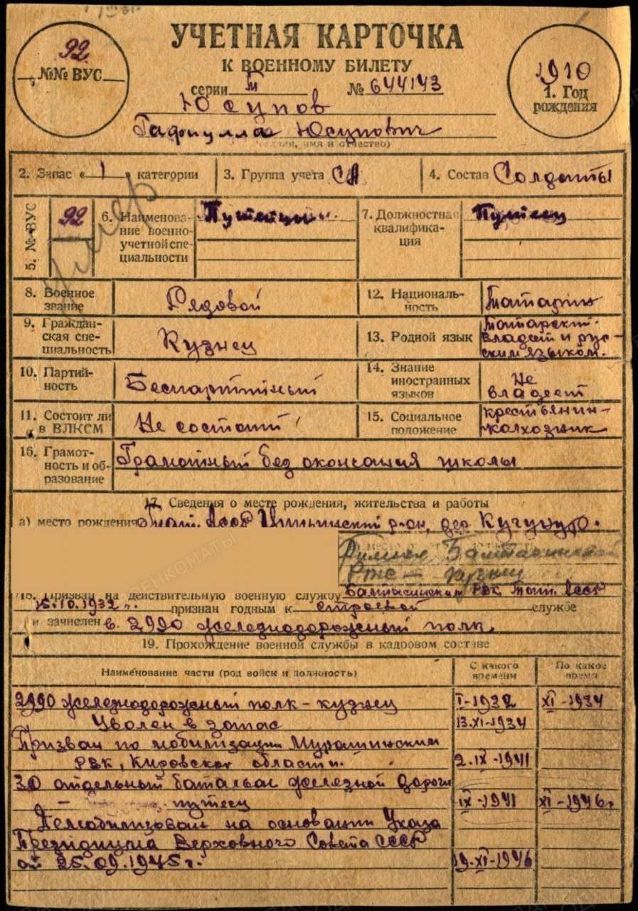 | призван Балтасинским РВК Татарской АССР | 15.10.1932 - 13.11.1934 | признан годным к строевой службе и призван в 2990 железнодорожный полк. Кузнец | |