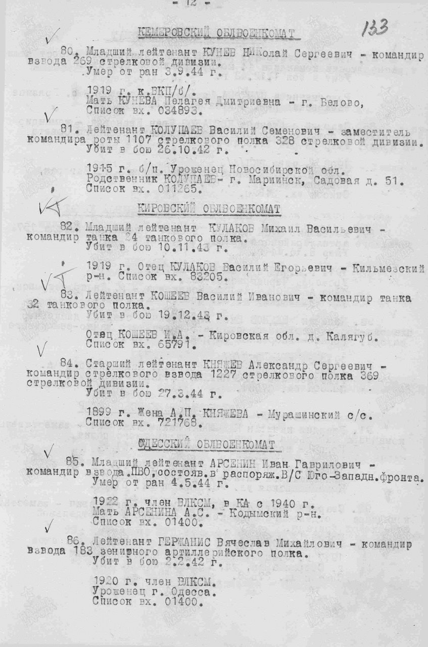 | 4306680015 | КНЯЖЕВ Александр Сергеевич | 1899 г. р., из д. Березовская Паломохинского с/с, призван в армию Опаринским РВК, ст. лейтенант, ком. взвода, 1227 сп, 369 сд. Погиб в бою 27.03.1944 г., захоронен в Могилевской обл., Быховский р-н, д. Обидовичи. | Кировская область, Мурашинский район |