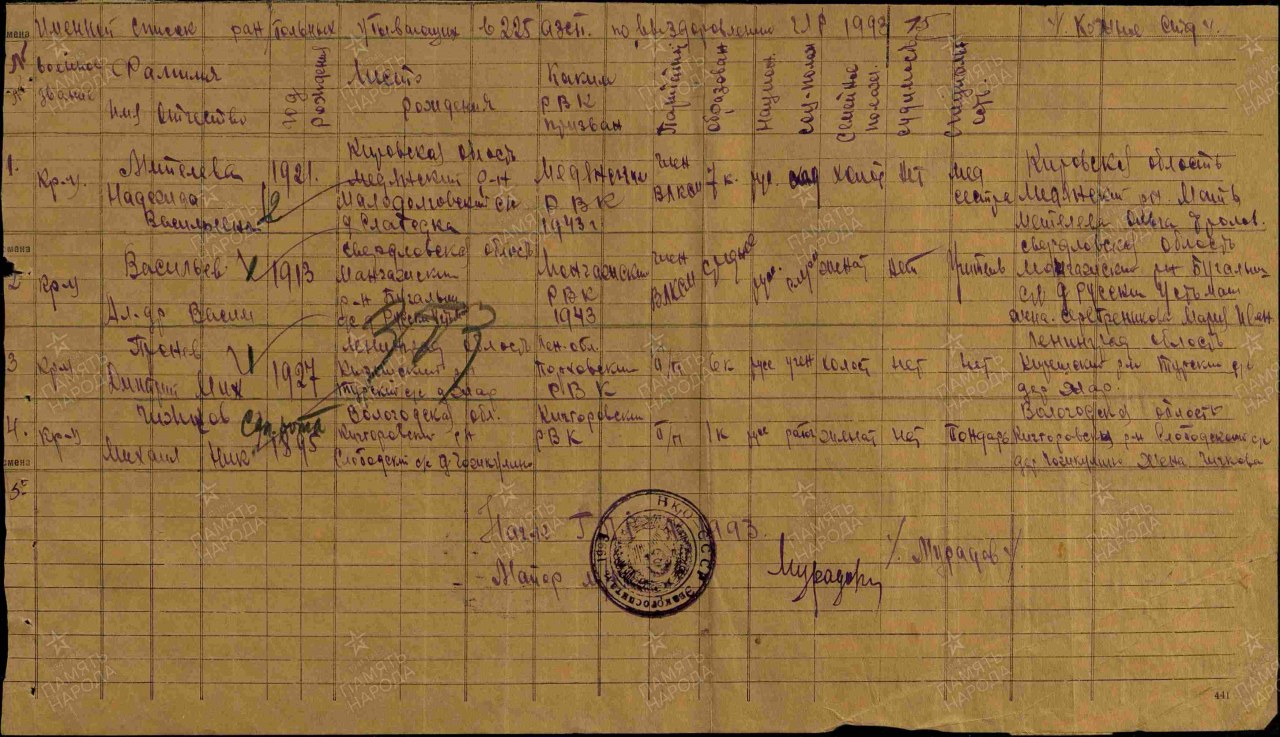 Дата и место призыва: __.__.1943(14.03.1941) Медянский РВК, Кировская обл., Медянский р-н ( Шурминский РВК, Кировская обл., Шурминский р-н)