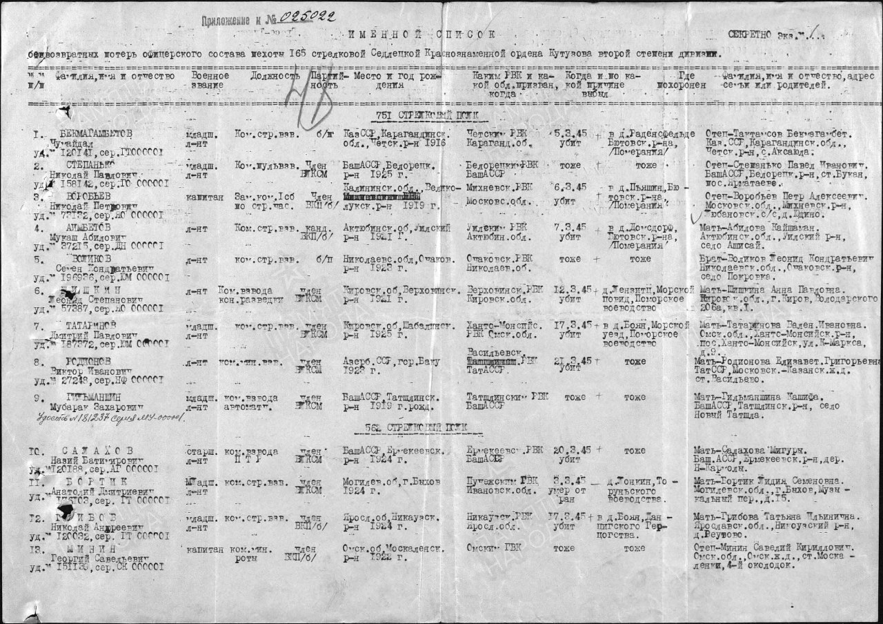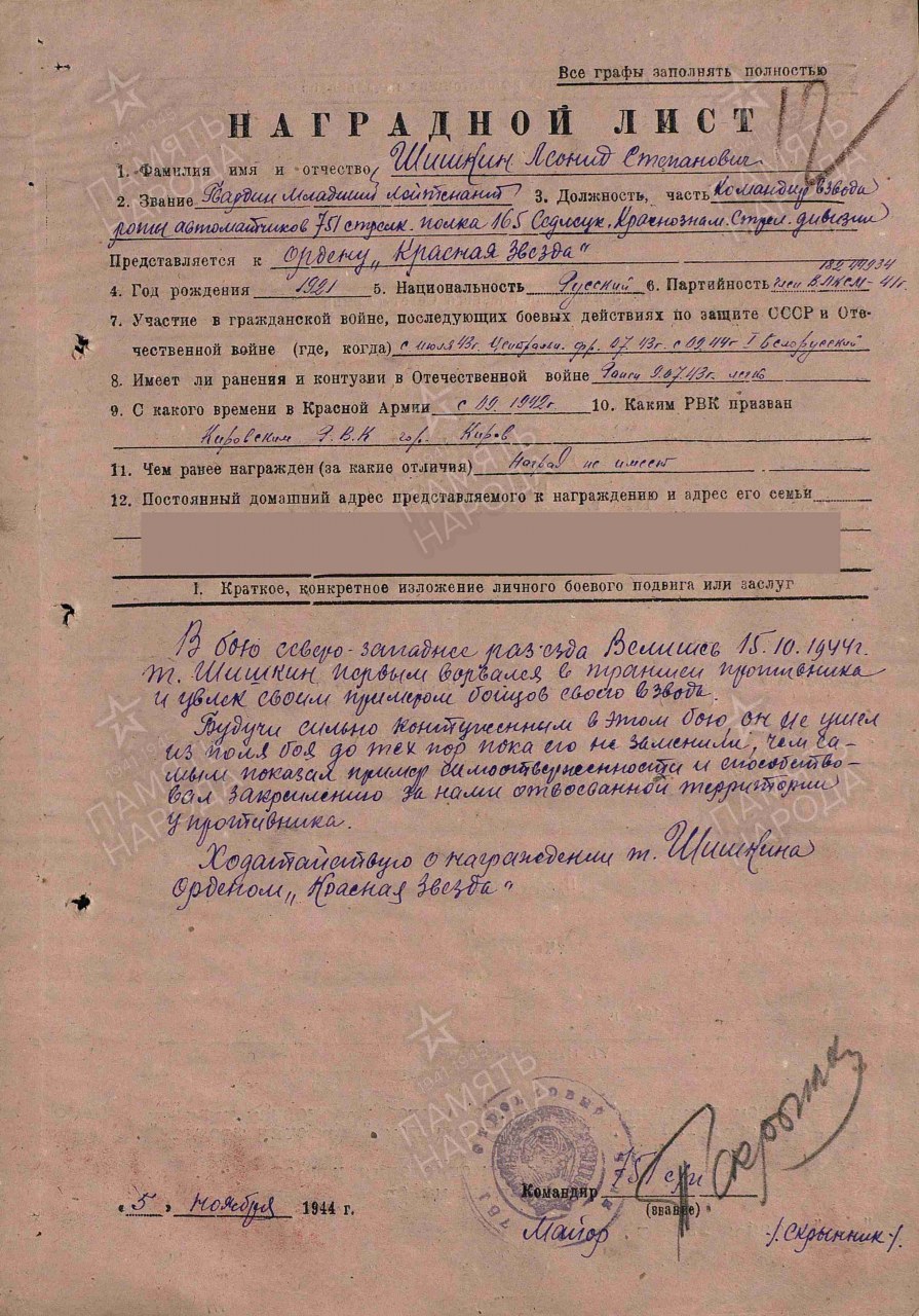 | 4315791019 | ШИШКИН Леонид Степанович | 1921 г. р., г. Киров, лейтенант, ком. взвода конной разведки 751 сп, 165 сд, мобилизован Молотовским РВК. Погиб в бою 12.03.1945 г. | Кировская область, Киров |