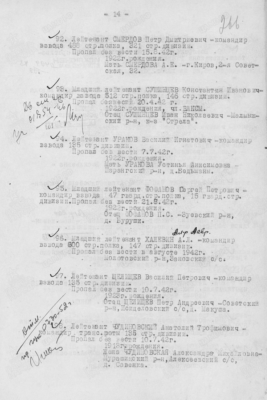 | 4315646022 | СМЕРДОВ Петр Дмитриевич | 1922 г. р., г. Киров, лейтенант, ком. взвода 488 сп, 321 сд, мобилизован Ждановским РВК. Погиб в бою 15.08.1942 г. Захоронен в брат. мог. на кладб. п. Крайний Волгоградской обл. | Кировская область, Киров |