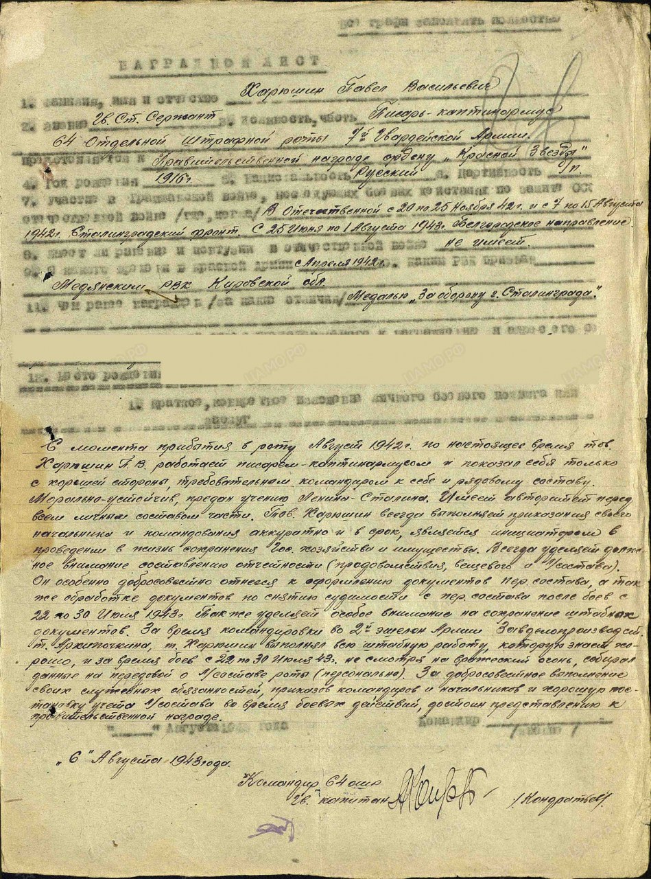 Воинская часть: 64 ошр 7 гв. А Дата прибытия: 27.08.1942