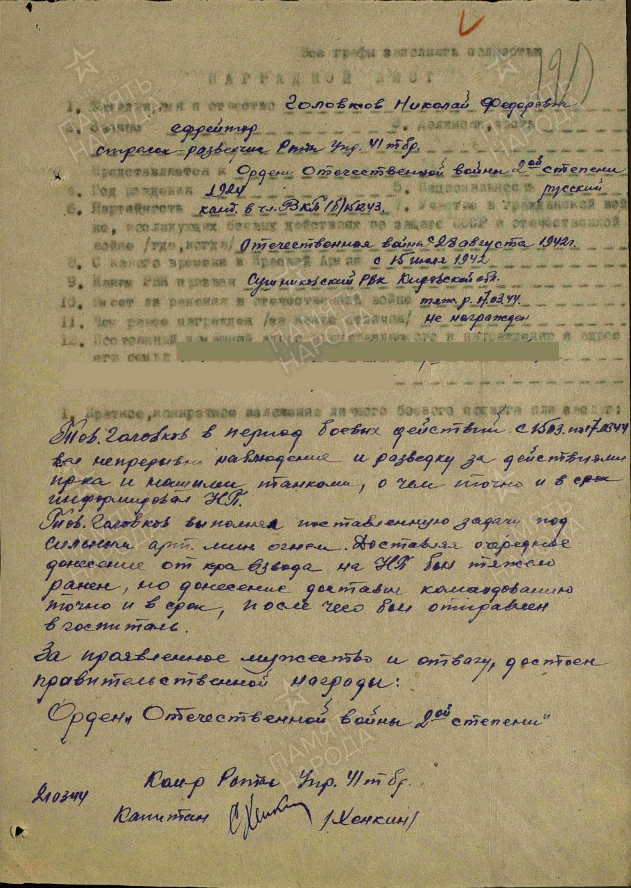| Родился | 1924 | деревня Осиновица (Сунский район, Кировская область) - существующий н.п. | Отец - Федор Егорович Головков, сестра Нина Федоровна Кириллова (Головкова) |