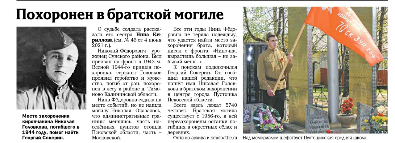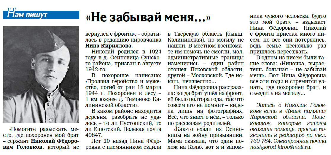 | 4311403028 | ГОЛОВКОВ Николай Федорович | 1924 г. р., из д. Осиновица, призван в августе 1942 года, сержант, погиб в марте 1944 г. Захоронен в д. Тимоново Тверской обл. | Кировская область, Сунский район |