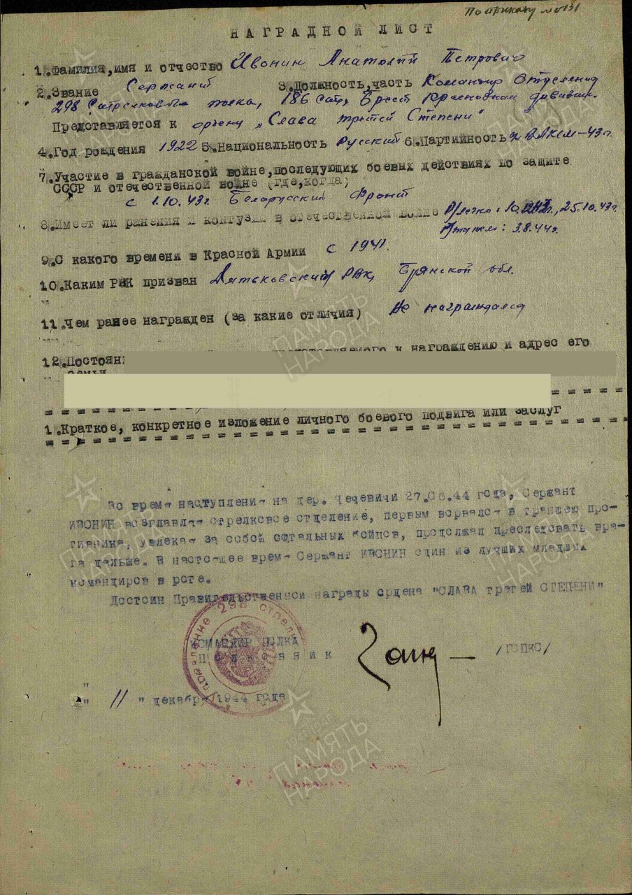 Военно-пересыльный пункт: 10 зсп 1 зсд Прибыл в часть: 01.11.1943