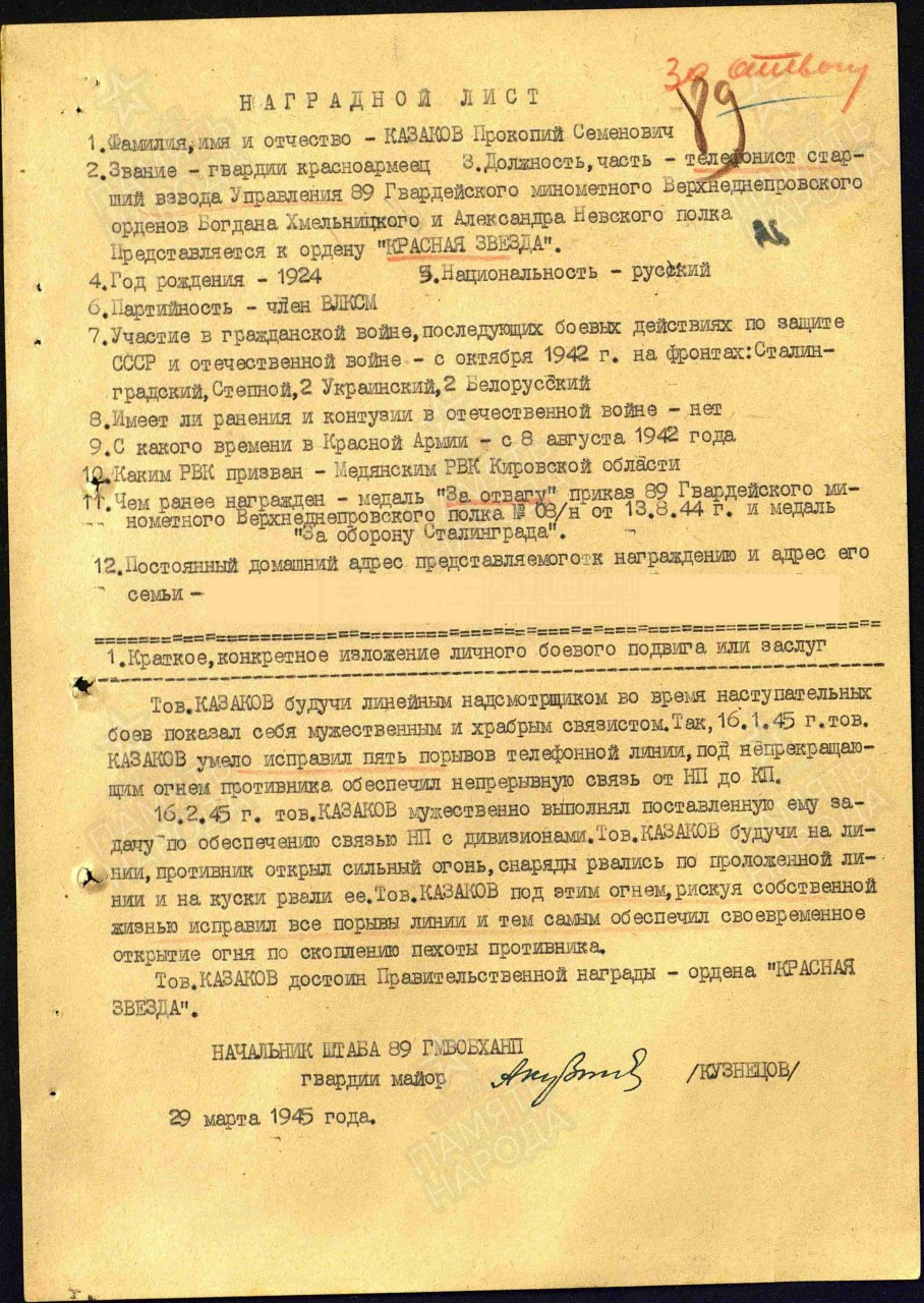 П. С. Казаков обслуживал подразделения гвардейских миномётов «катюша». Надо знать, что эти боевые установки после каждого залпа снимались с позиции и перебазировались на другое место. Иначе - неминуемая гибель (немцы охотились за «катюшами»). И всё же подразделения несли потери. К моменту, когда генерал Паулюс был окружён, и пленён, в полку, где служил наш земляк, из 24 установок осталось только 13.