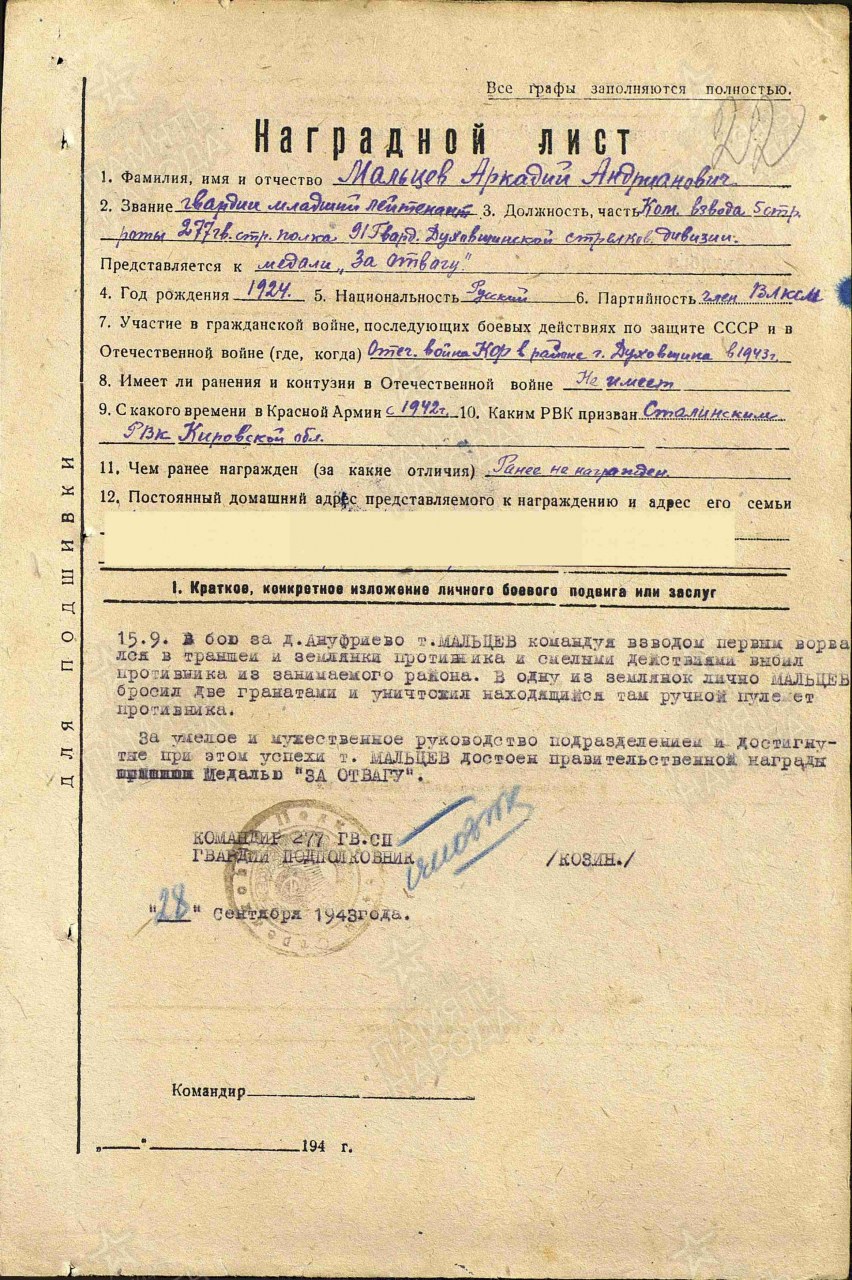 | 4308607015 | МАЛЬЦЕВ Аркадий Андрианович | 1924 г. р., Чудиновский с/с, Халтуринский р-н, призван Медянским РВК, Кировской обл., мл. лейтенант, ком. взвода 277 гв. сп, погиб 16.10.1943 года. | Кировская область, Орловский район | |||