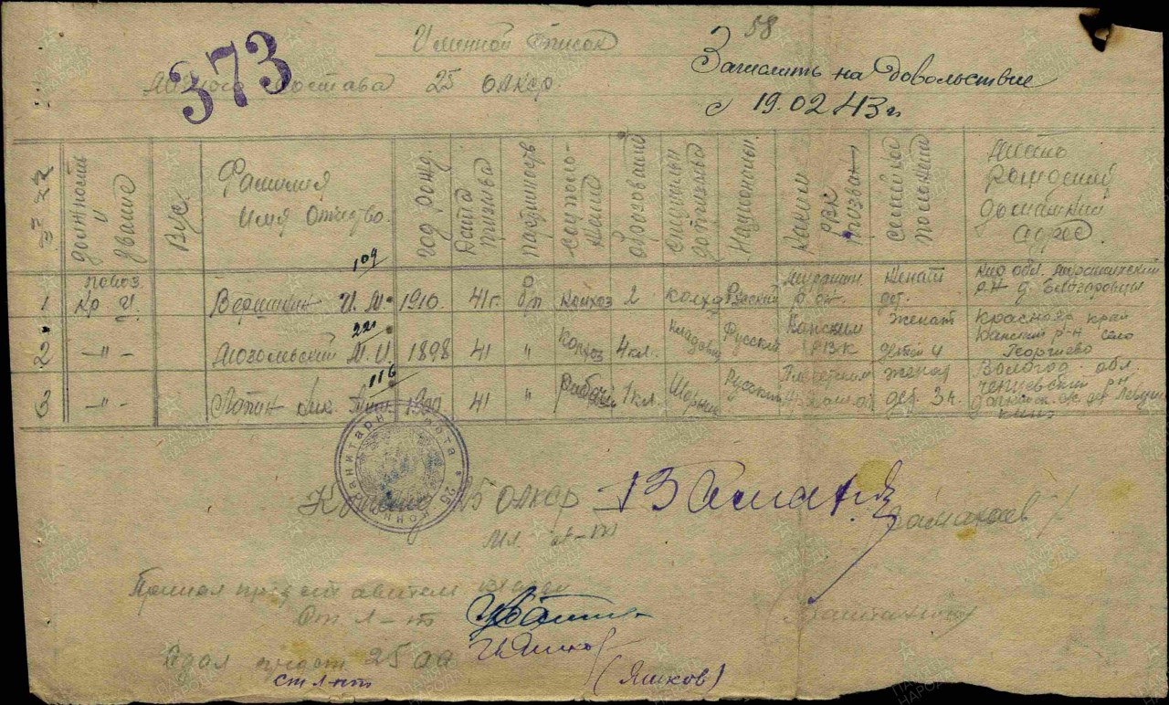 | участие в Великой Отечественной войне | Июль 1941 - 1945 | Воинское звание: красноармеец Военно-пересыльный пункт: 131 армейский запасной стрелковый полк. Прибыл в часть: 18.02.1943 Откуда прибыл: 25 конно-санитарная рота Информация об архиве - Источник информации: ЦАМО Фонд ист. информации: 8417 Опись ист. информации: 190625 Дело ист. информации: 11 Воинское звание: красноармеец Военно-пересыльный пункт: 131 армейский запасной стрелковый полк Выбытие из воинской части: 19.02.1943 Куда выбыл: 3 бригада морской пехоты Балтийского флота Информация об архиве - Источник информации: ЦАМО Фонд ист. информации: 8417 Опись ист. информации: 190625 Дело ист. информации: 13 | |