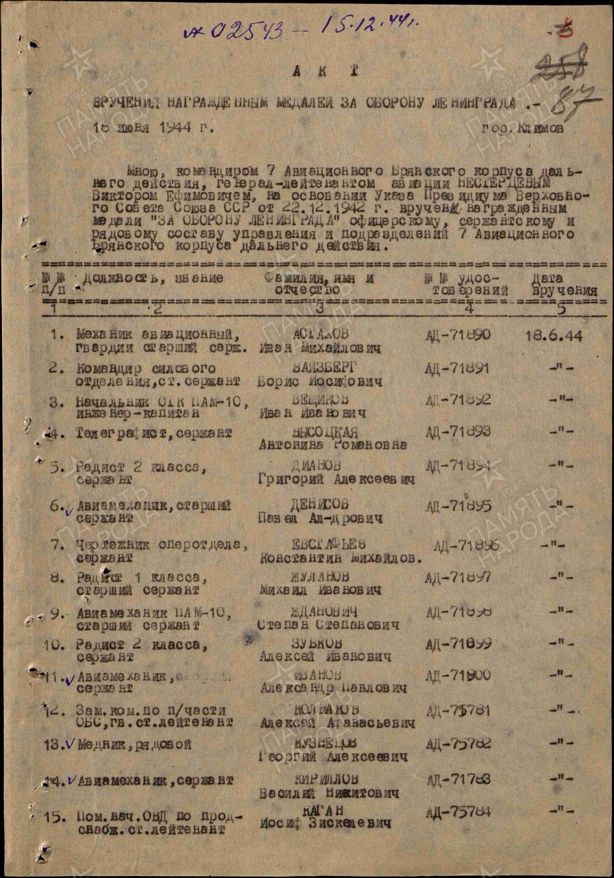 | Награждён: Медаль «За оборону Ленинграда» | 18.06.1944 | 7 авиационный корпус Дальнего действия | Воинское звание: сержант. Воинская часть: 16 обс ( 16 отдельный батальон связи) Информация об архиве - Архив: ЦАМО Фонд ист. информации: 33 Опись ист. информации: 44677 Дело ист. информации: 272 Воинское звание: сержант Воинская часть: 7 авк ДД ( 7 авиационный корпус Дальнего действия) Приказ подразделения №: 116 от: 18.06.1944 Издан: 7 авк ДД Информация об архиве - Архив: ЦАМО Фонд ист. информации: 33 Опись ист. информации: 44677 Дело ист. информации: 272 |