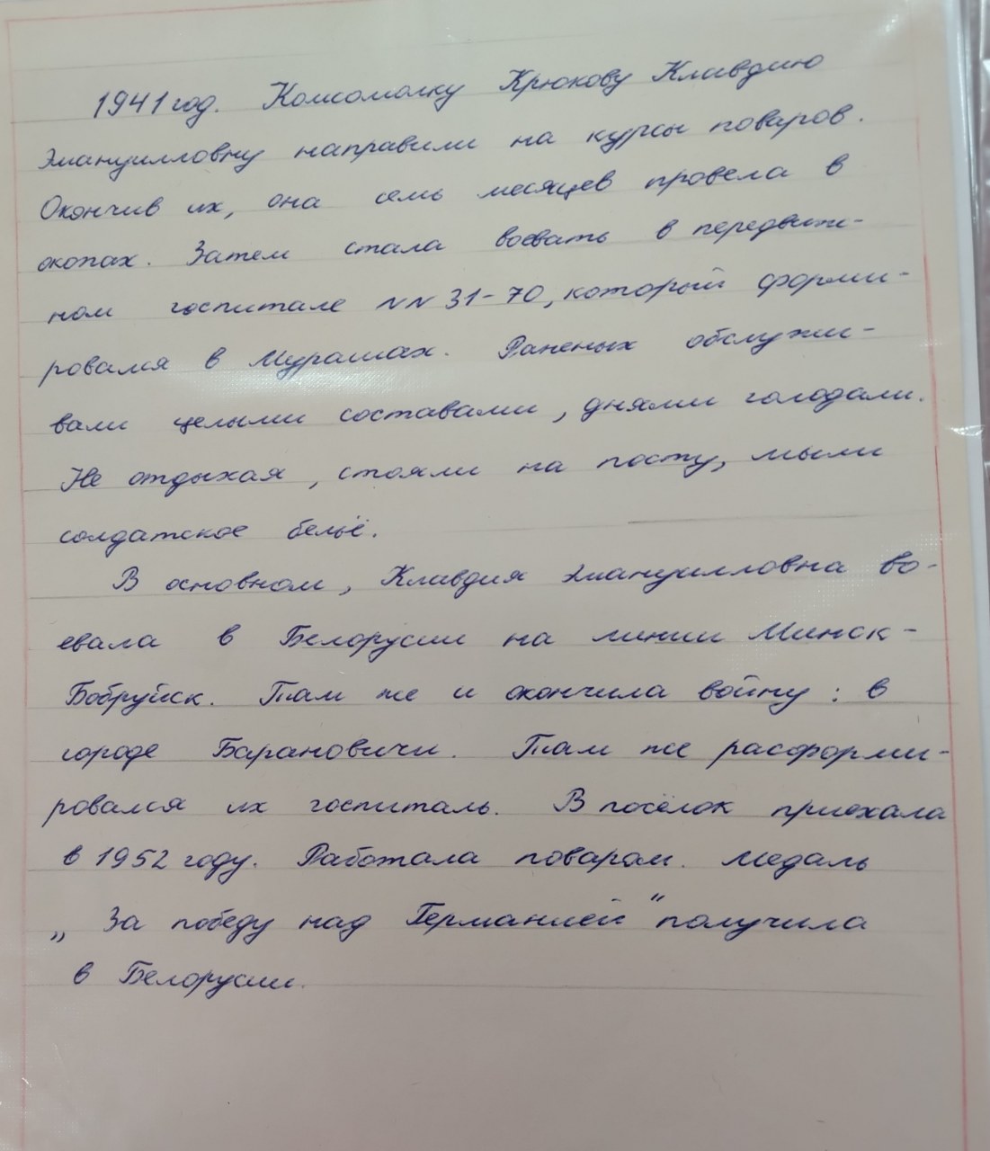 | участие в Великой Отечественной войне | 1941 - 15.09.1944 | город Мураши (Мурашинский район, Кировская область) - существующий н.п. | Повар. Эвакогоспиталь № 3170. ЭГ 3170 находился в г. Мураши Кировской области (железнодорожный клуб им. Коминтерна и школа № 28) с 14.08.1941 по 15.09.1944. |