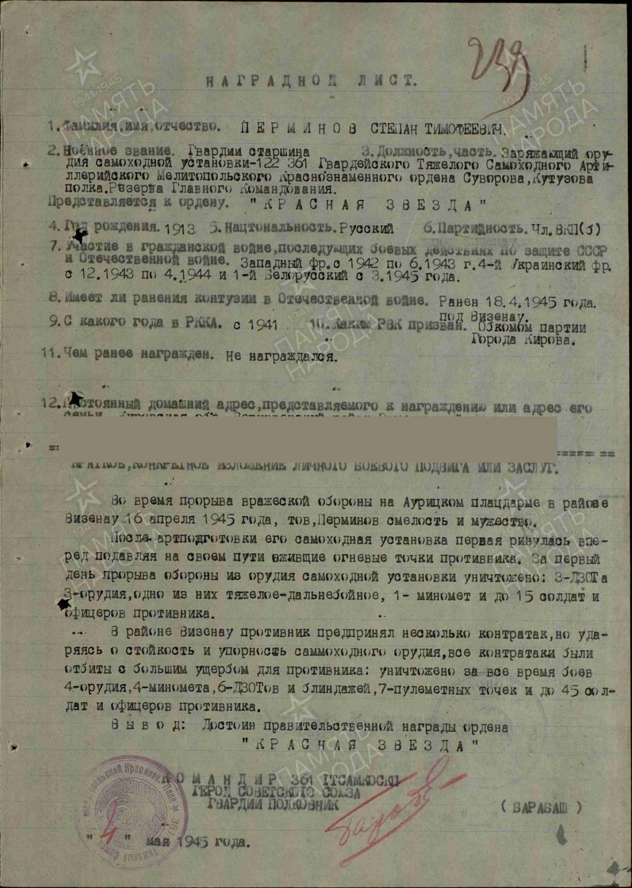 Воинское звание: гв. старшина, заряжающий СУ-122